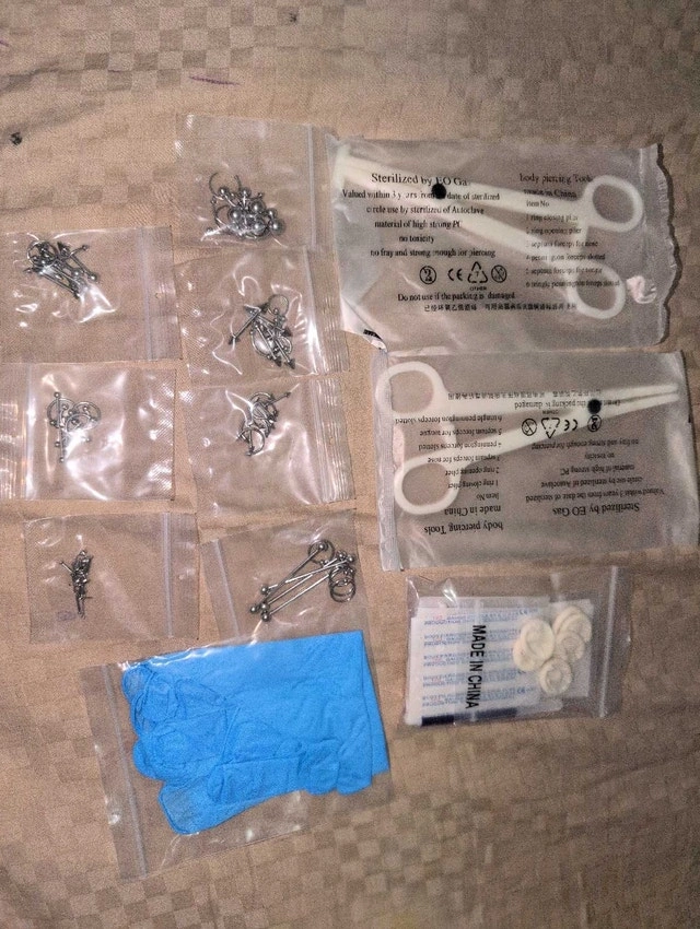 This professional body piercing kit is brand new and ready for use, featuring a variety of sterilized tools and assorted jewelry styles. The set includes gloves, piercing needles, forceps and various styles of jewelry. It's all you need to get started. Here is what's included: Sterilized piercing needles, Piercing forceps, Gloves, Assorted body jewelry. If the ad is still up, it's still available.