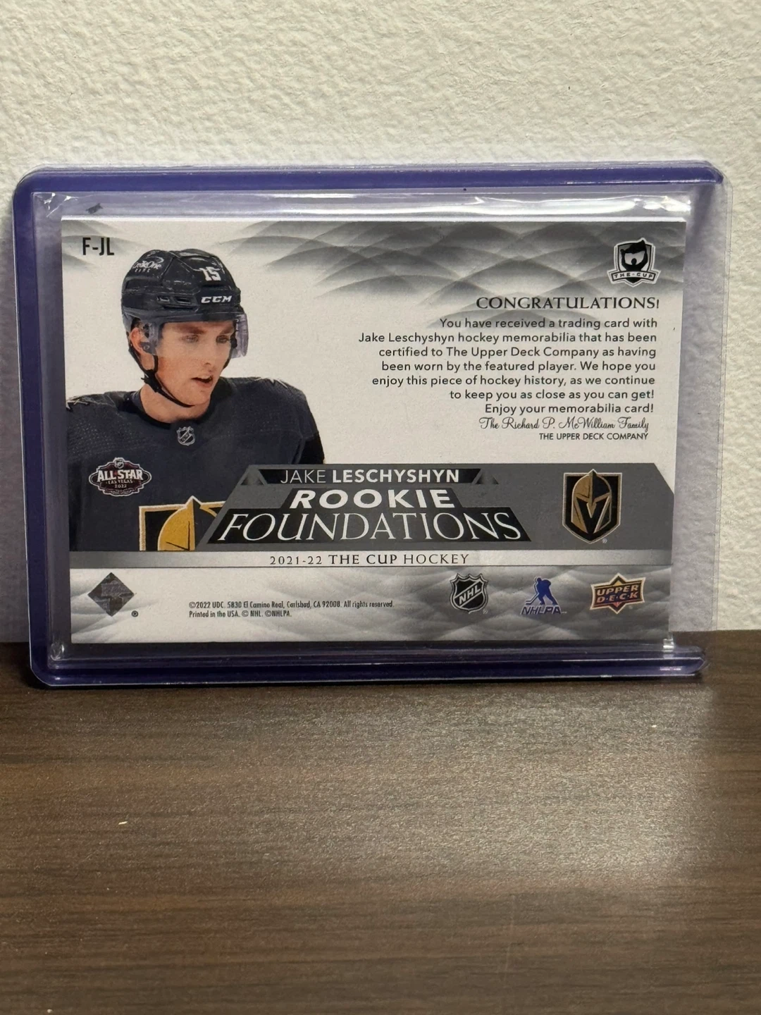 Selling a Jake Leschyshyn Rookie Foundations card from the 2021-22 The Cup Hockey series. It features a piece of hockey jersey memorabilia. A great collectible for any Golden Knights fan!