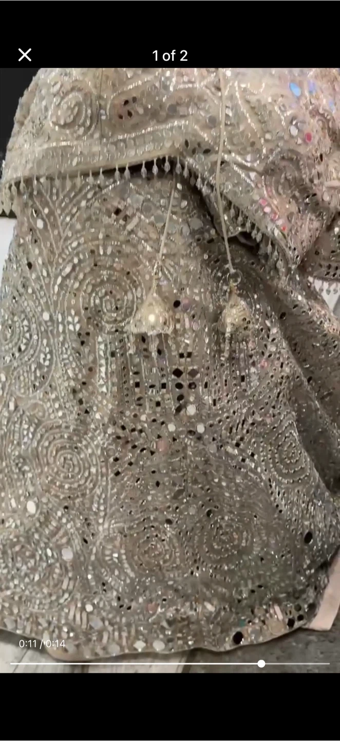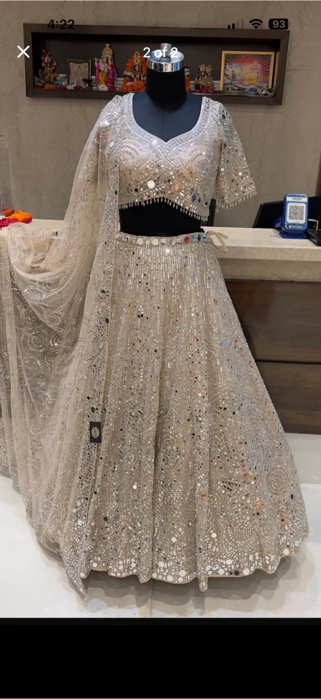 Gorgeous embellished lehenga choli set with a matching dupatta. Intricate mirror work and bead detailing throughout. Perfect for festive occasions and weddings!