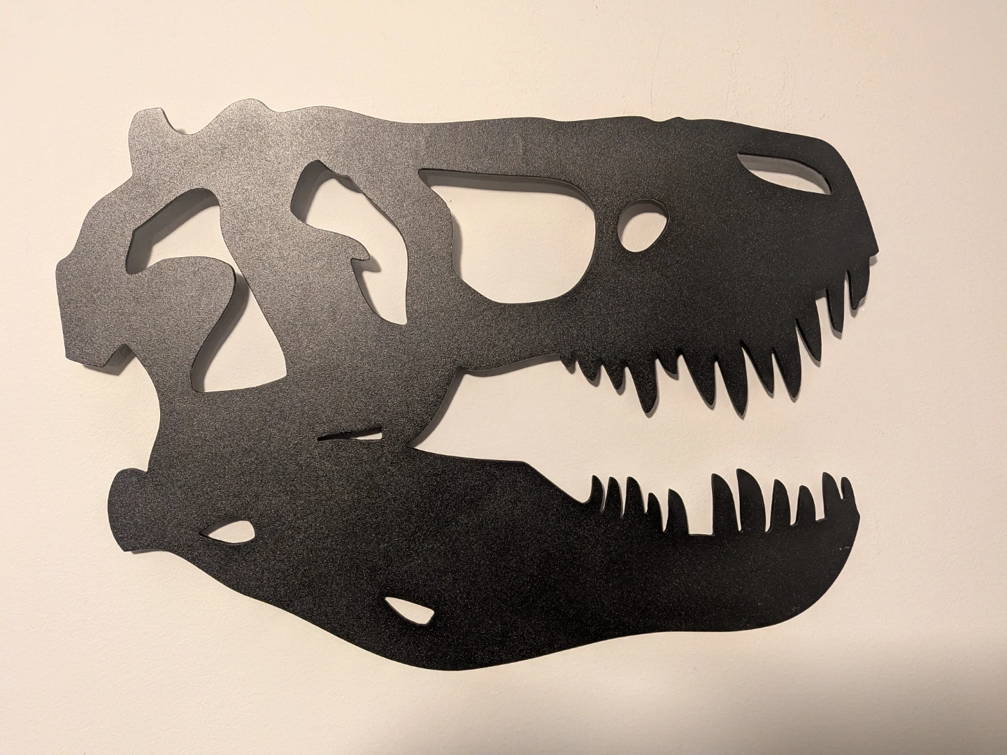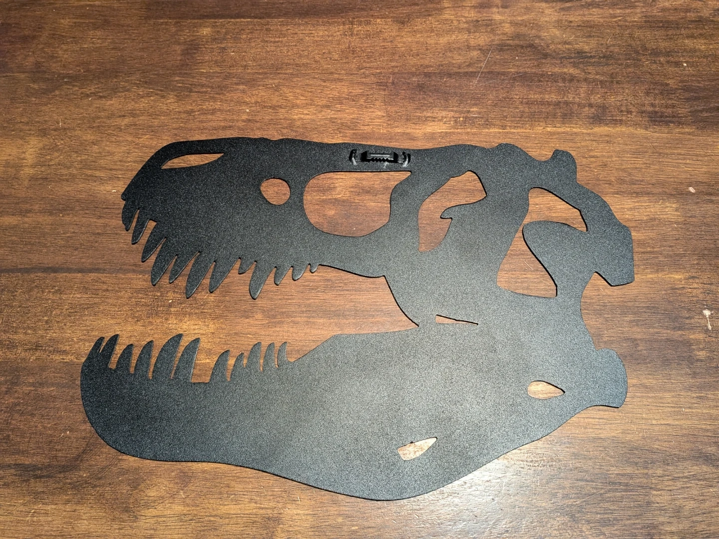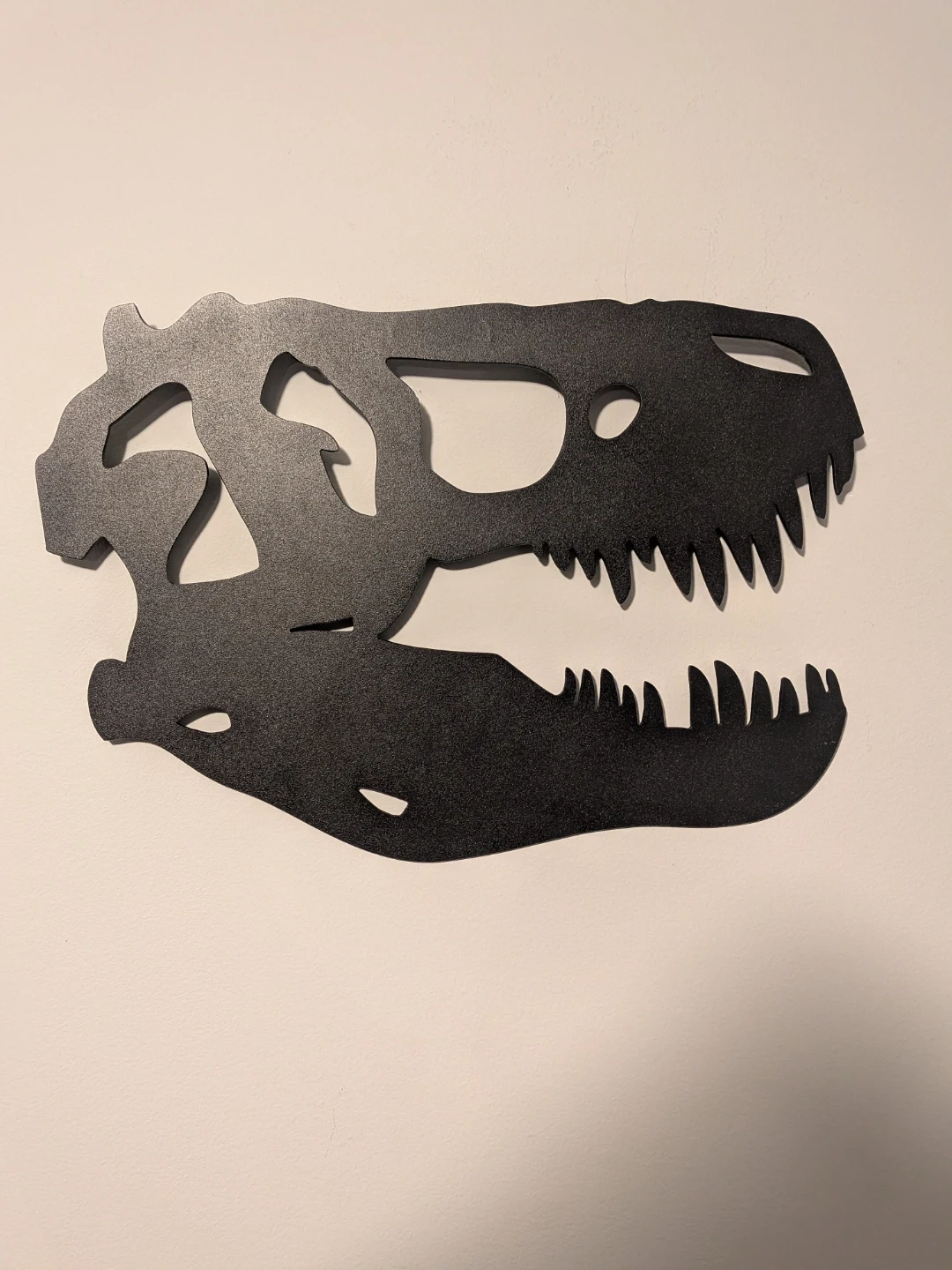 This is a black metal wall art piece shaped like a dinosaur skull. It has a matte finish and a hanging mechanism on the back. It's a cool decoration for any room!