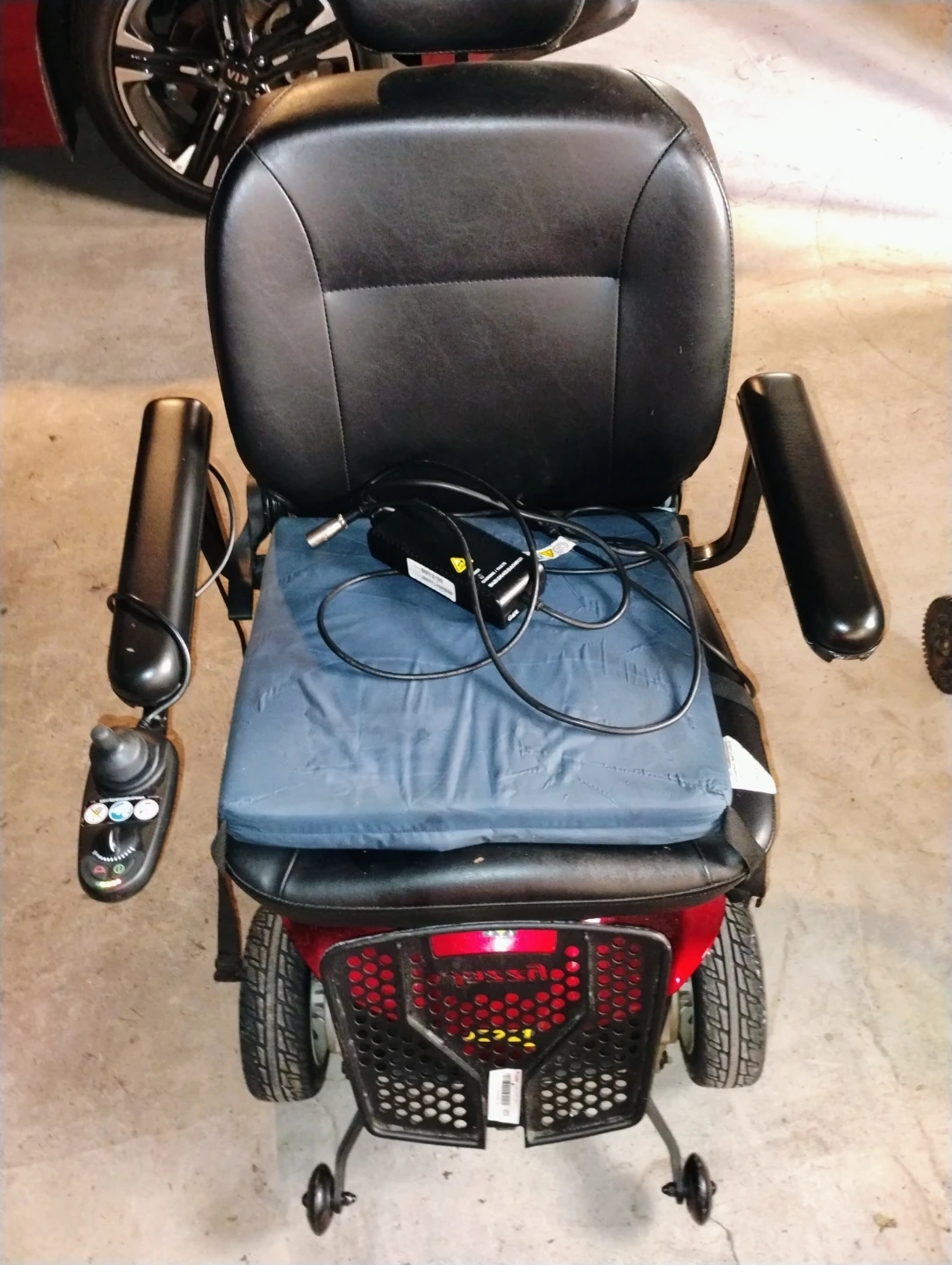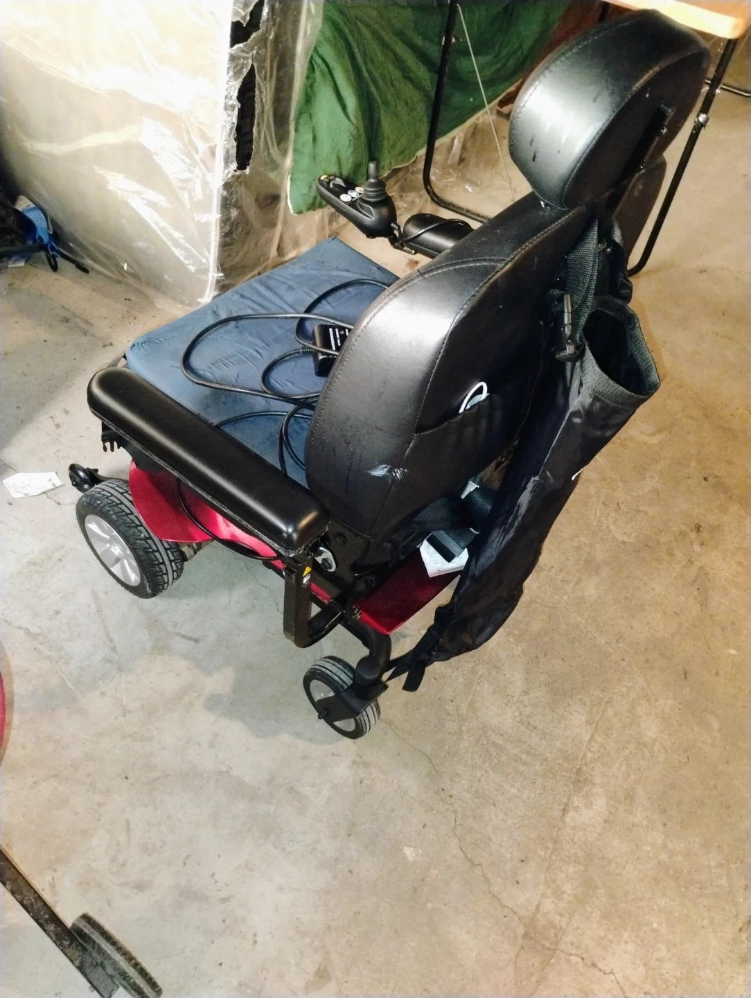 Pride Mobility Jazzy 6 ES power wheelchair. Black leather seat and frame. Includes charger and a hanging storage pouch. This power wheelchair offers comfortable and reliable mobility.