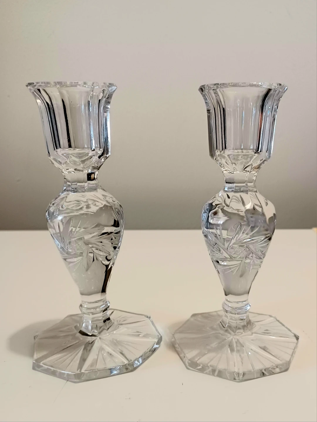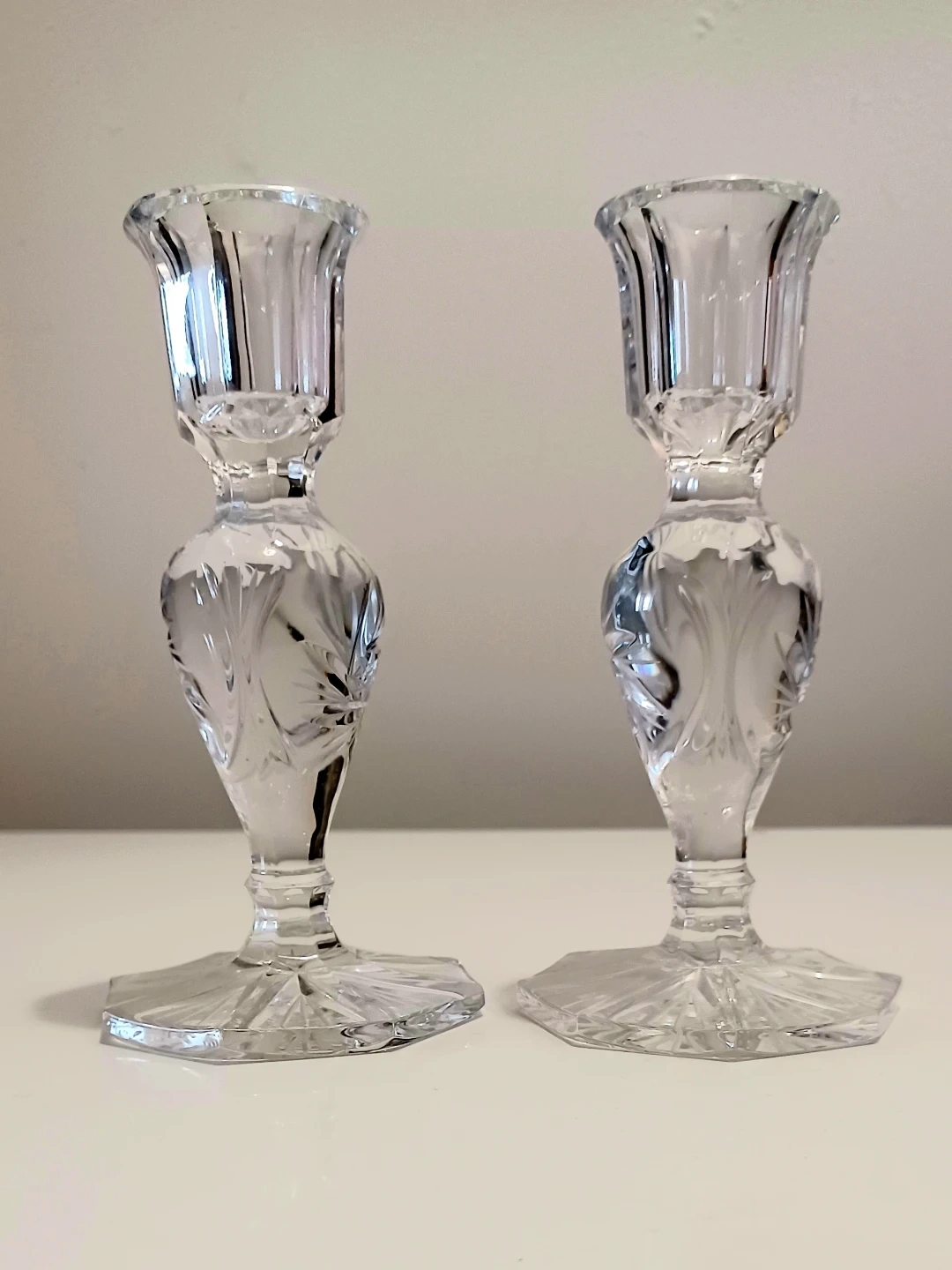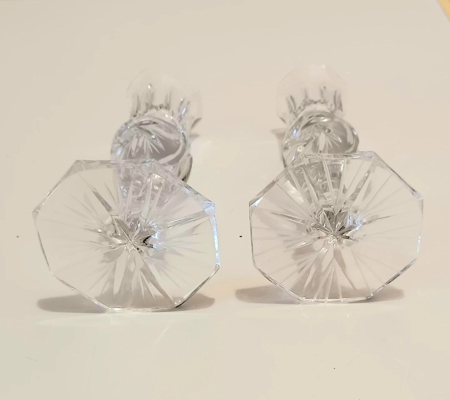 Add a touch of elegance to your home with this beautiful vintage pair of American Eleanor Pinwheel, Hand Cut Crystal Candlesticks, perfect for creating a warm and inviting atmosphere. Each Candlestick features a Hexagonal Base and a flared top designed for tapered candles.