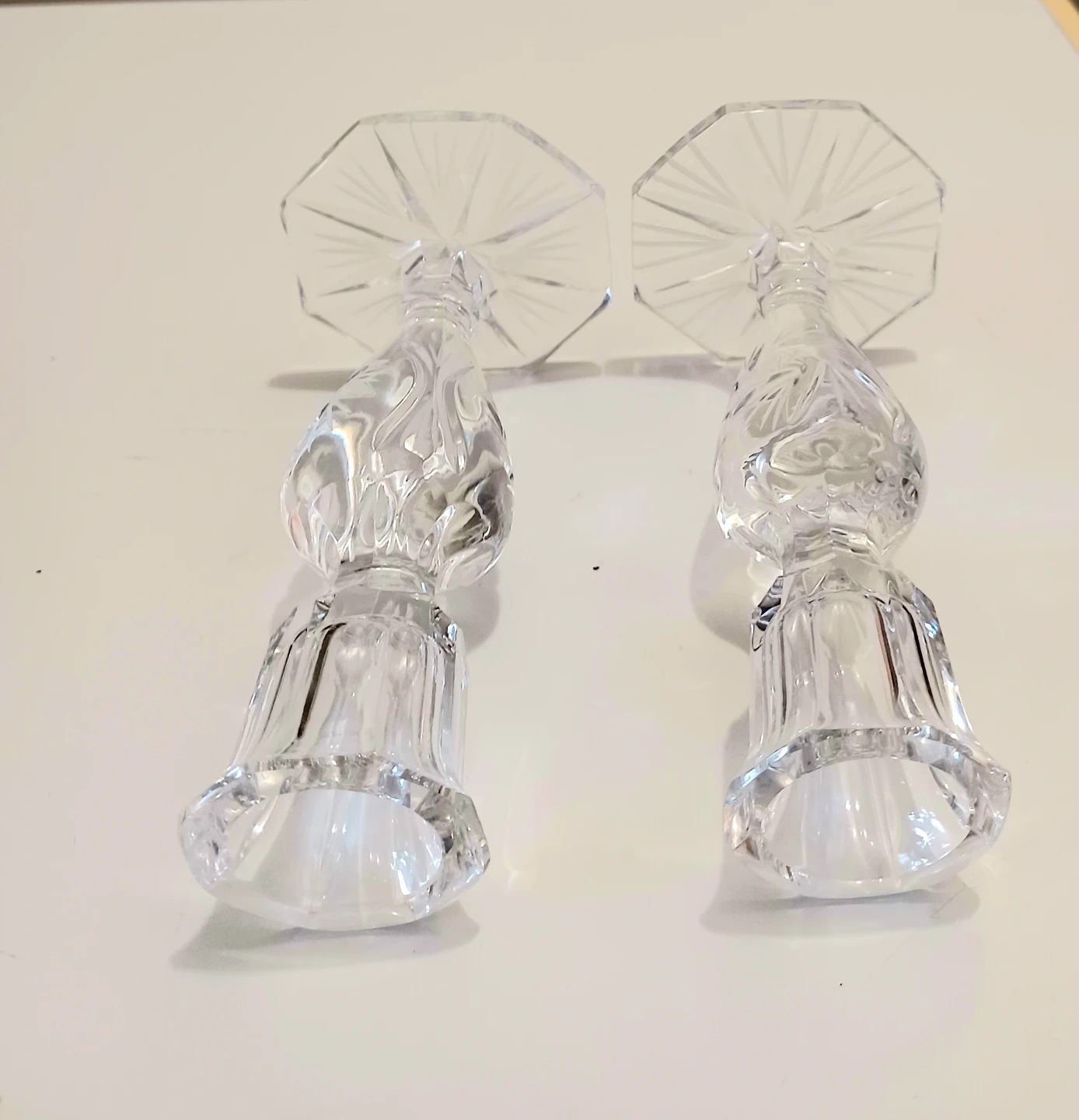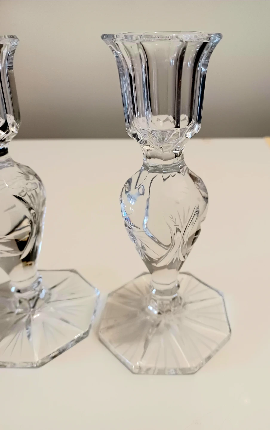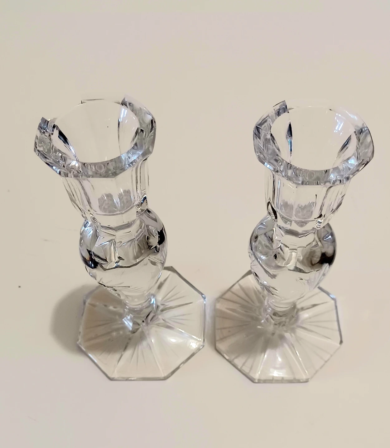 Add a touch of elegance to your home with this beautiful vintage pair of American Eleanor Pinwheel, Hand Cut Crystal Candlesticks, perfect for creating a warm and inviting atmosphere. Each Candlestick features a Hexagonal Base and a flared top designed for tapered candles.