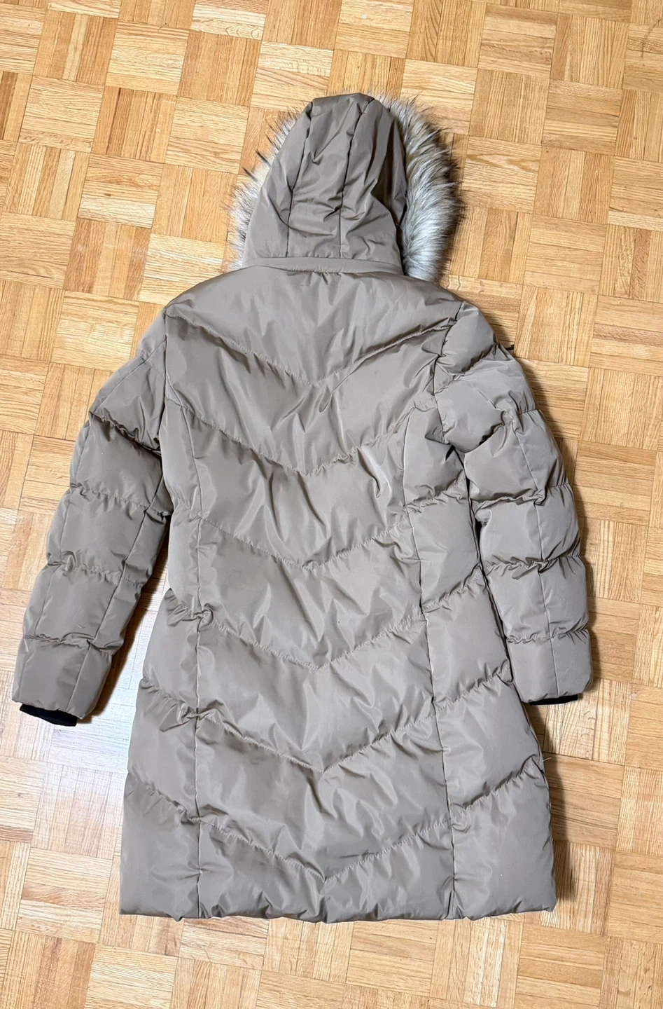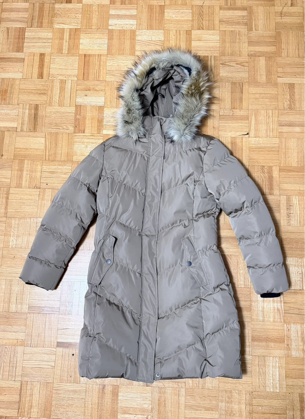 Selling puffer coat in size large.The coat is a neutral beige colour and has a faux fur hood. It's new and ready to keep you warm this winter!