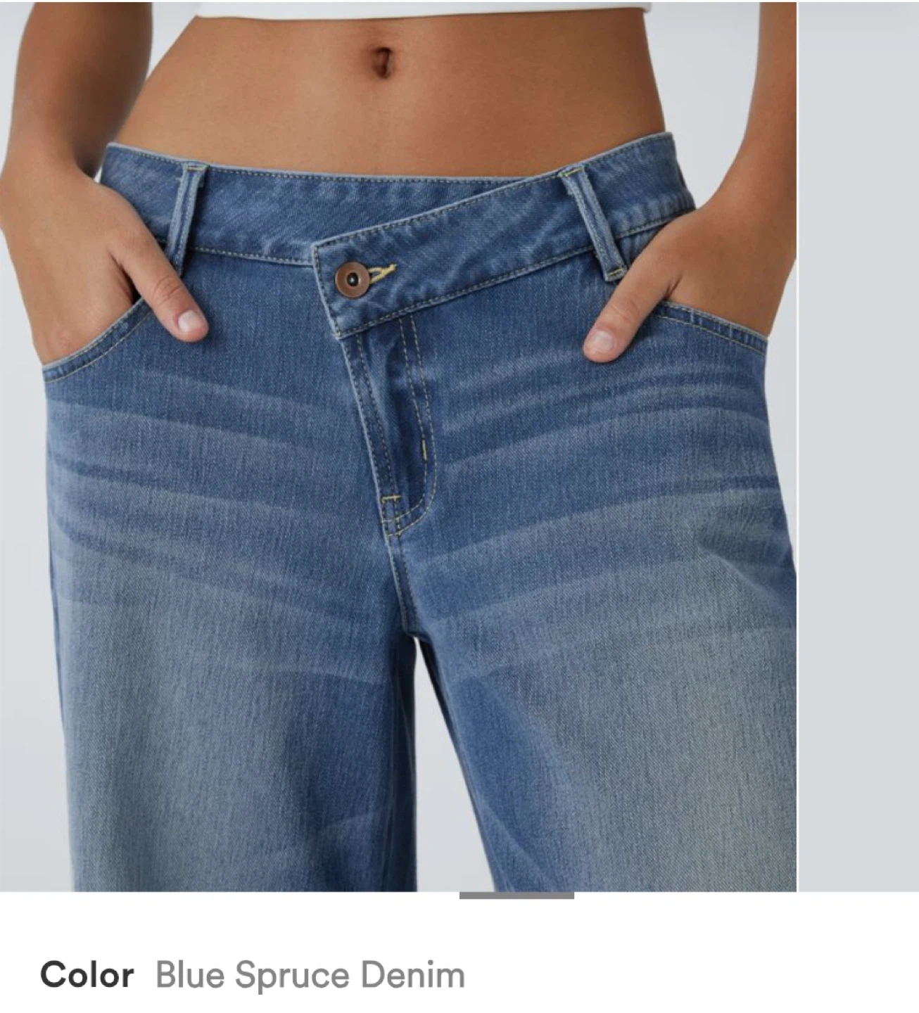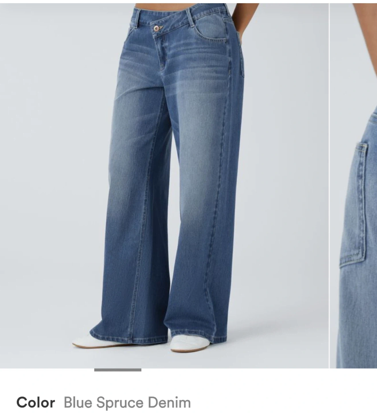 These wide-leg jeans come in a blue spruce denim wash. They feature a unique crossover waist. Denim material.