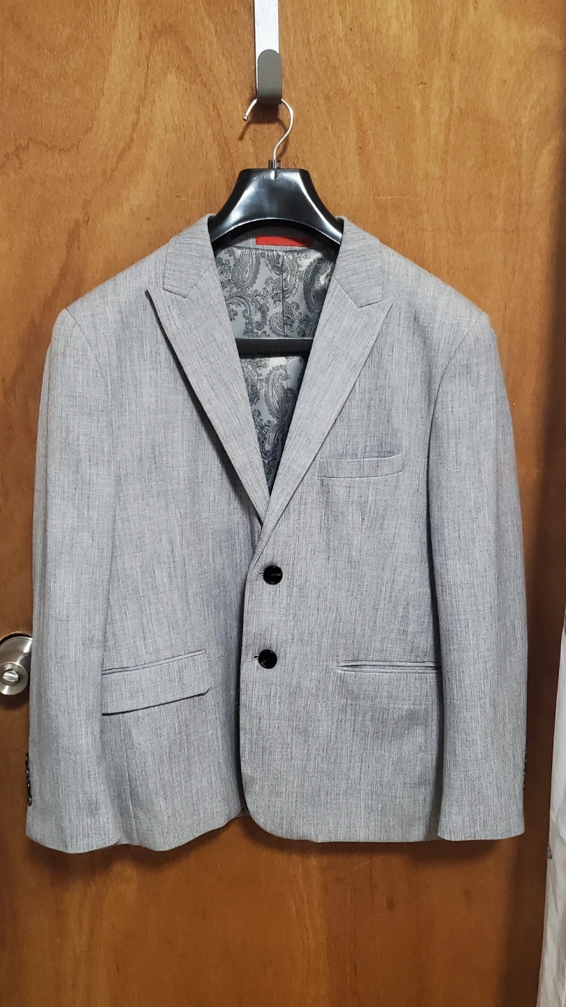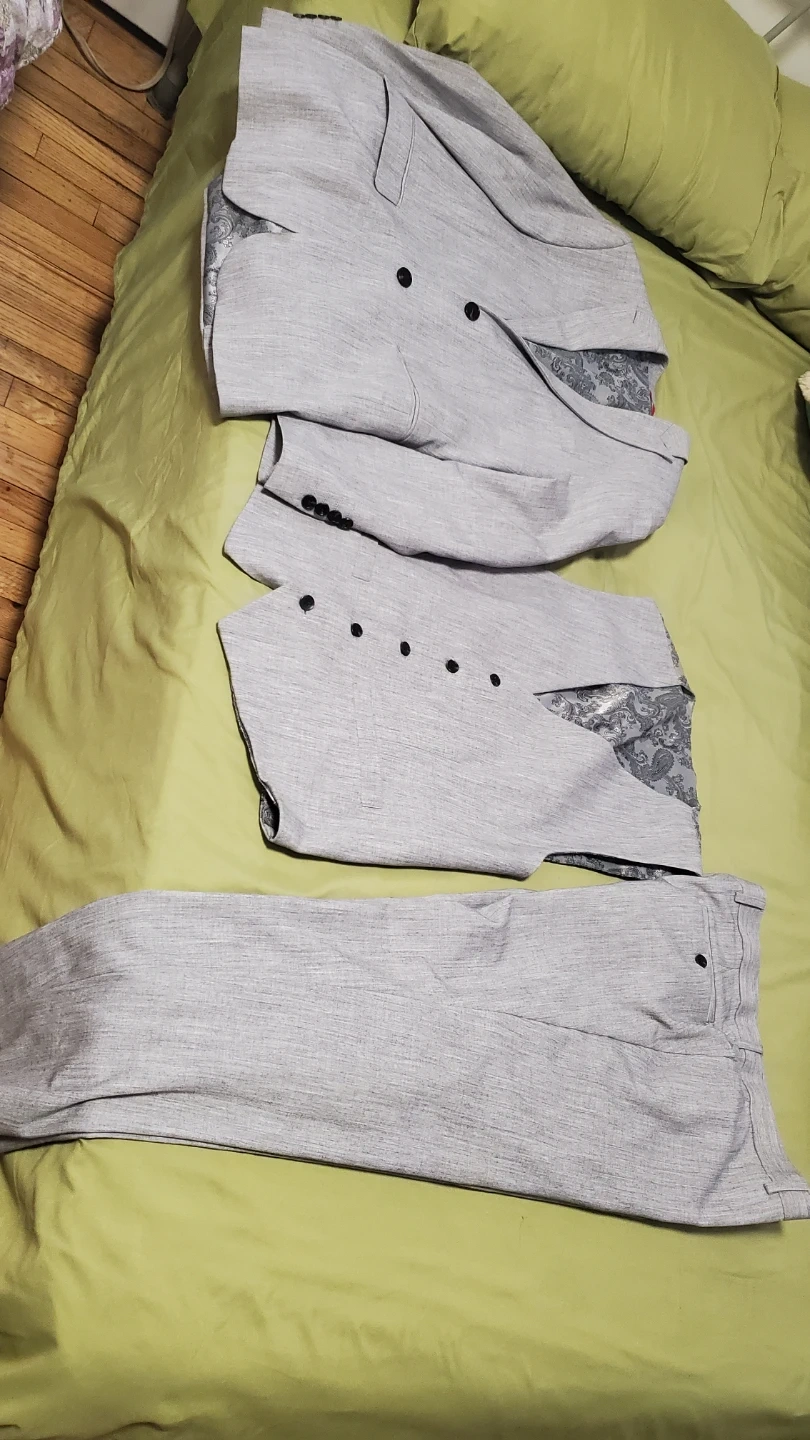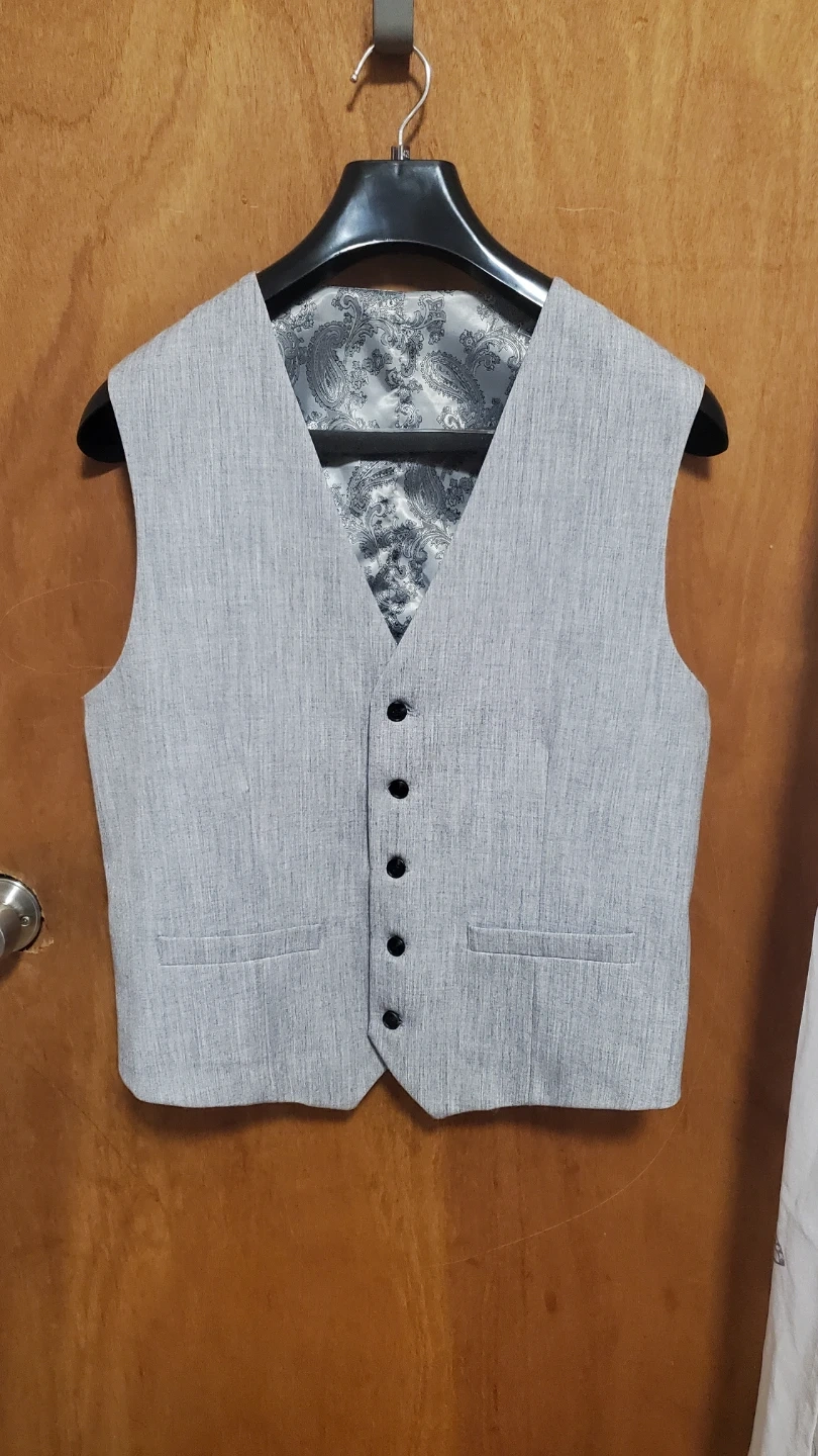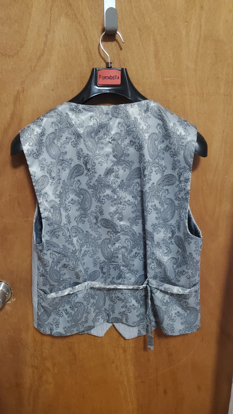 Selling a men's gray suit vest and jacket. The vest has a paisley pattern on the back. Both items are in good condition and ready for a new owner,,
