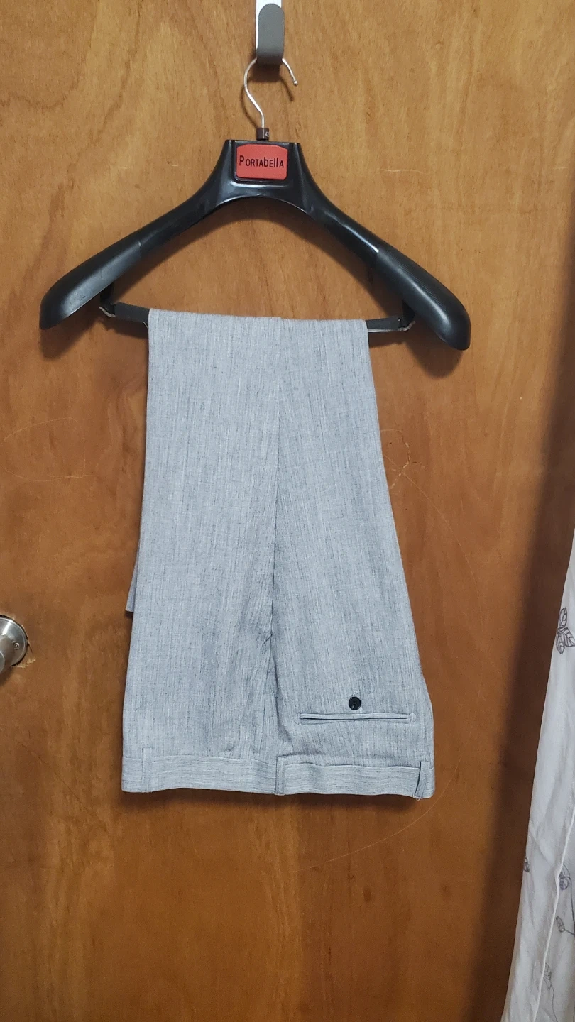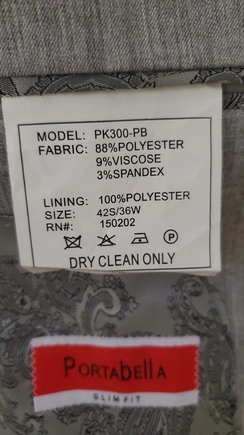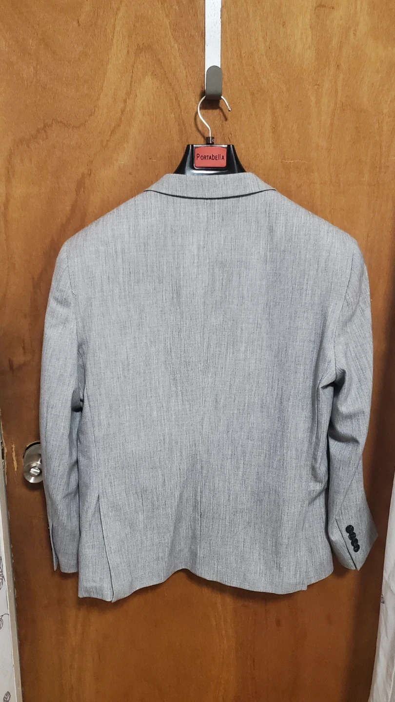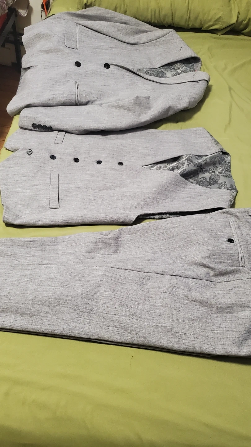 Selling a men's gray suit vest and jacket. The vest has a paisley pattern on the back. Both items are in good condition and ready for a new owner,,
