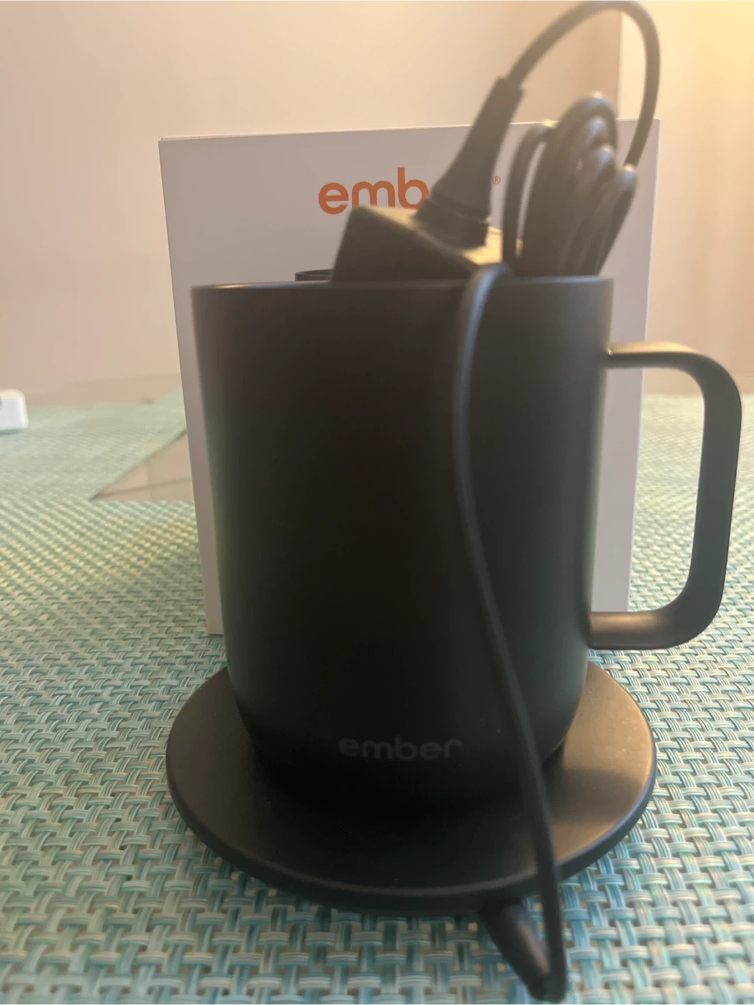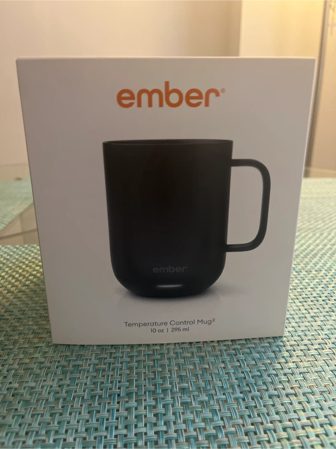 Ember Temperature Control Mug² in black. This is the 10 oz (295 ml) version. It's designed to keep your drink at the perfect temperature. Includes charging coaster and power adapter.