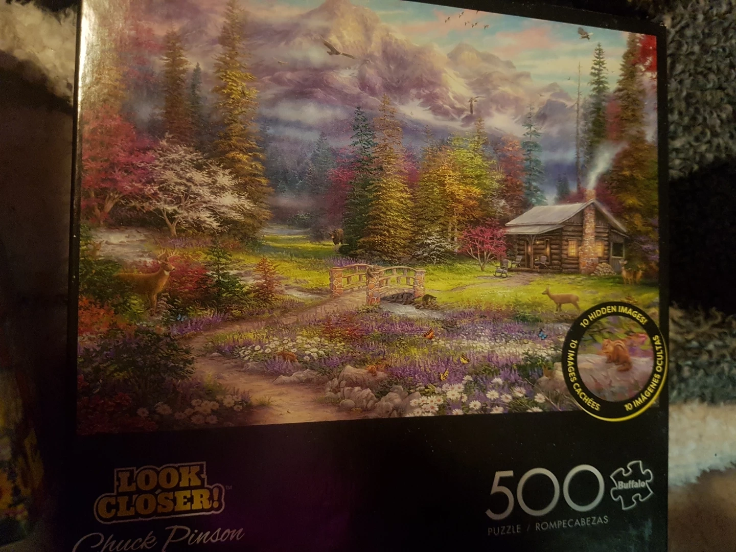 This Buffalo Games jigsaw puzzle features a scenic woodland cabin with deer and a chipmunk. It has 500 pieces and includes 10 hidden images for an extra challenge. It's a fun activity for puzzle enthusiasts!