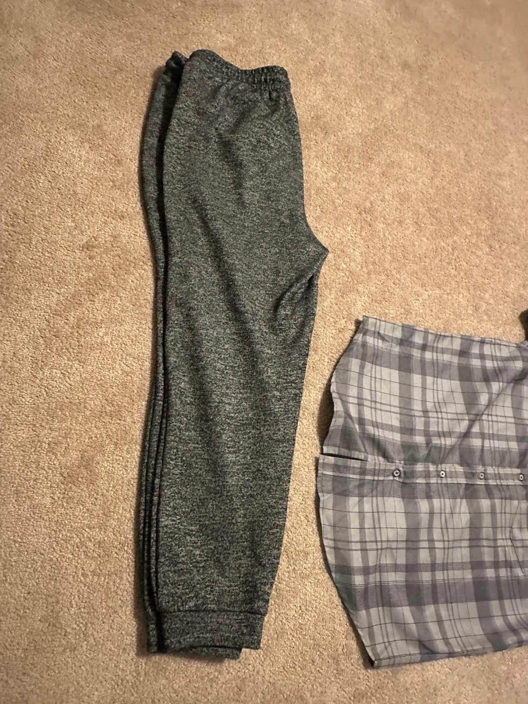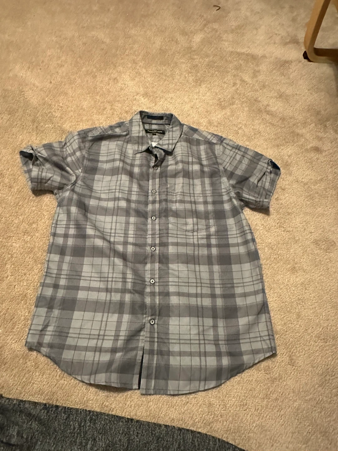 Comfortable men's short sleeve button-up shirt. Features a grey plaid pattern and a single chest pocket. Made from a soft fabric blend for all-day wear. Great for casual outings!