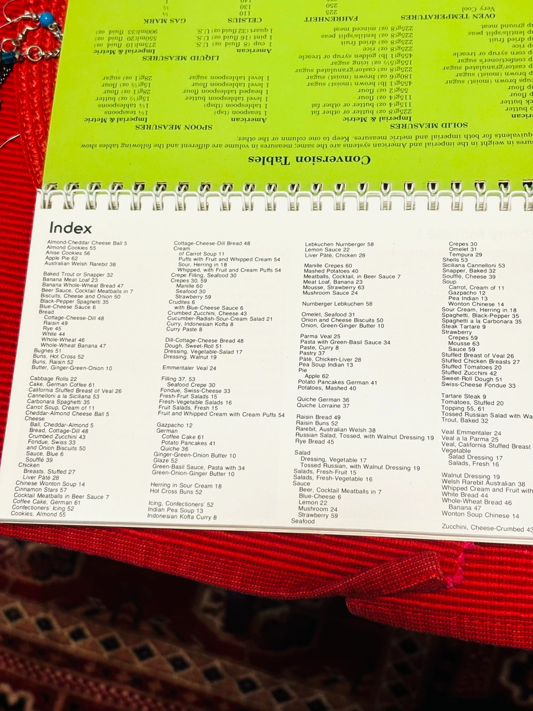 Spiral-bound cookbook with recipes and conversion tables. The cover features a photo of several food dishes.