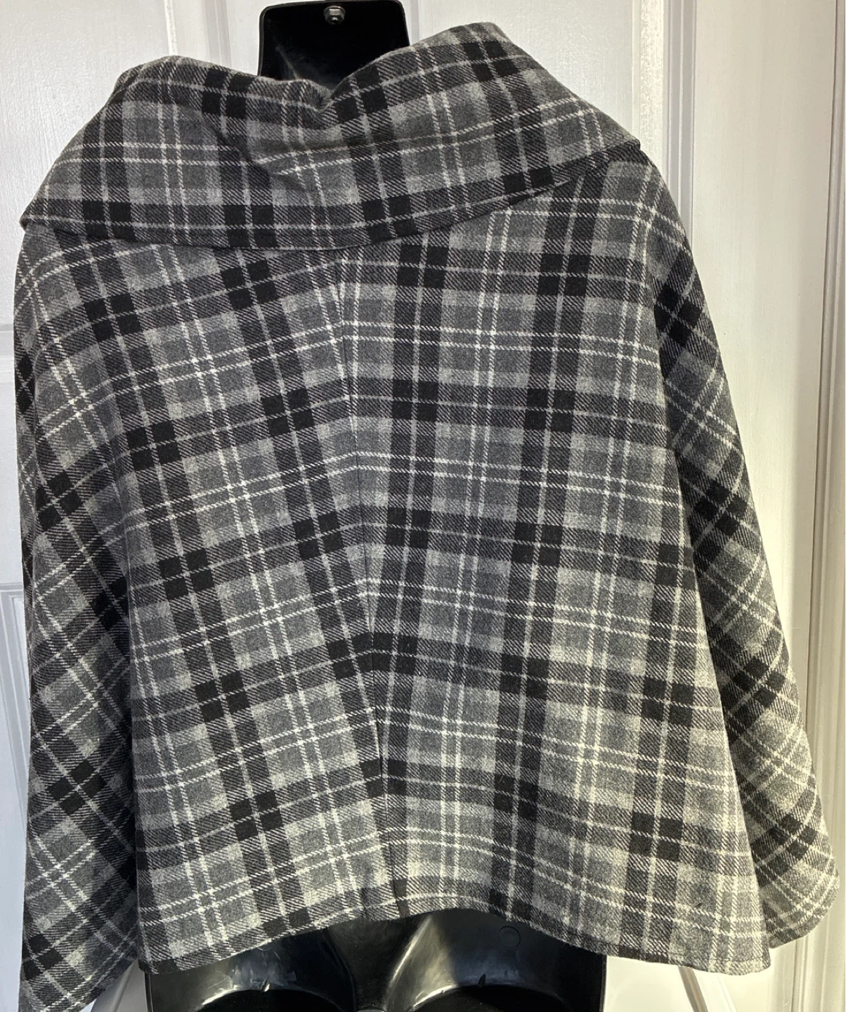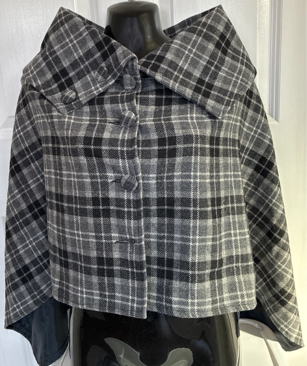 A stylish grey and black plaid cape with a dramatic oversized collar. It fastens at the front with two buttons. This cape is great for layering over outfits during cooler weather.