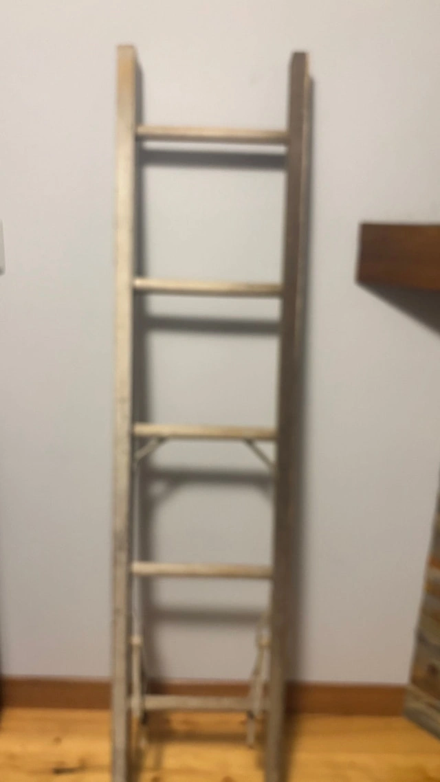 This is an antique five-step wooden ladder, perfect for adding a touch of rustic charm to your home or garden. Given its age, it presents in fair condition, bearing the marks of time which only add to its character. Perfect for blankets. Approximate measurements: Height: 5’5”, Width: 1 ‘. Cash accepted.
