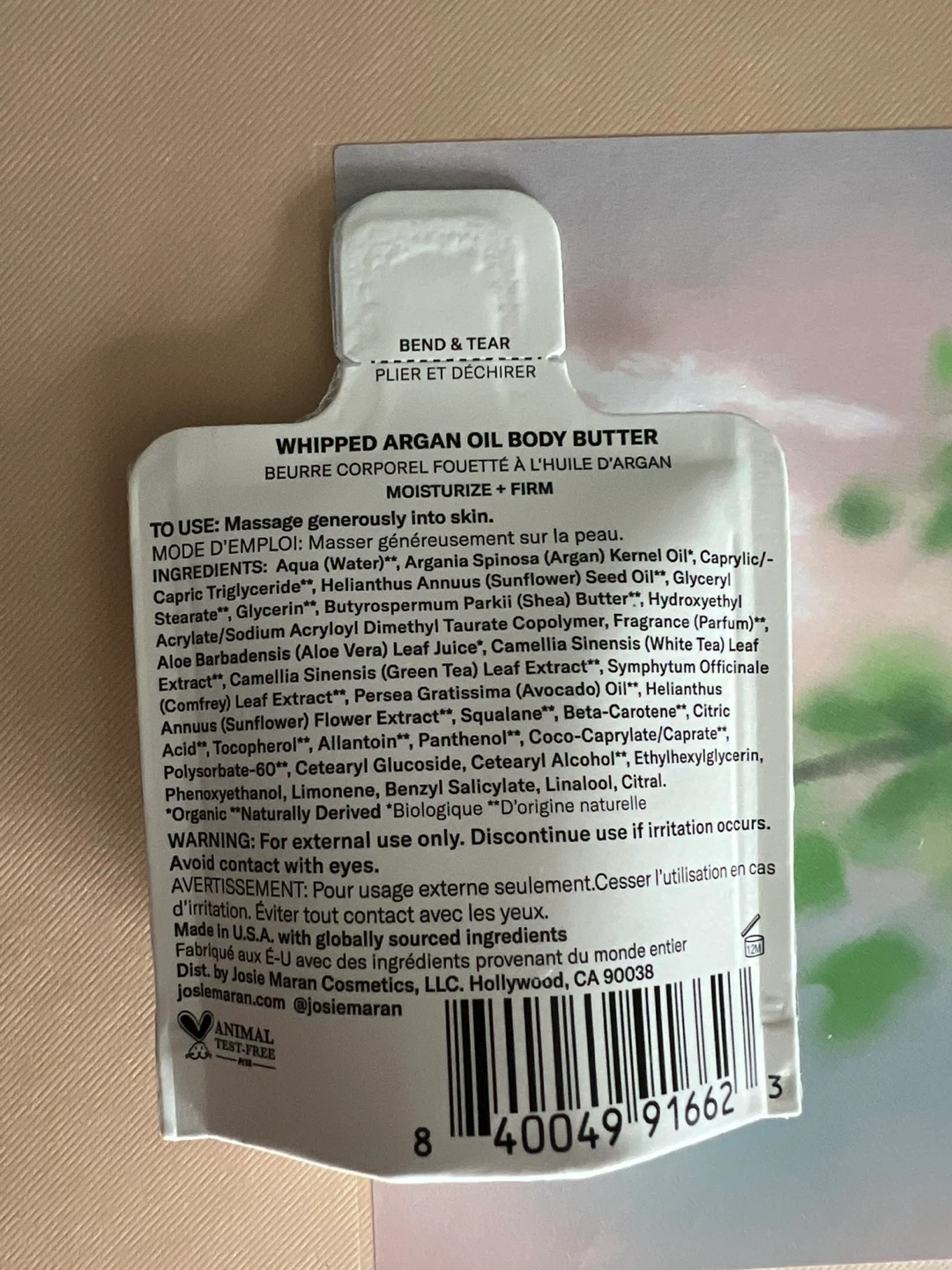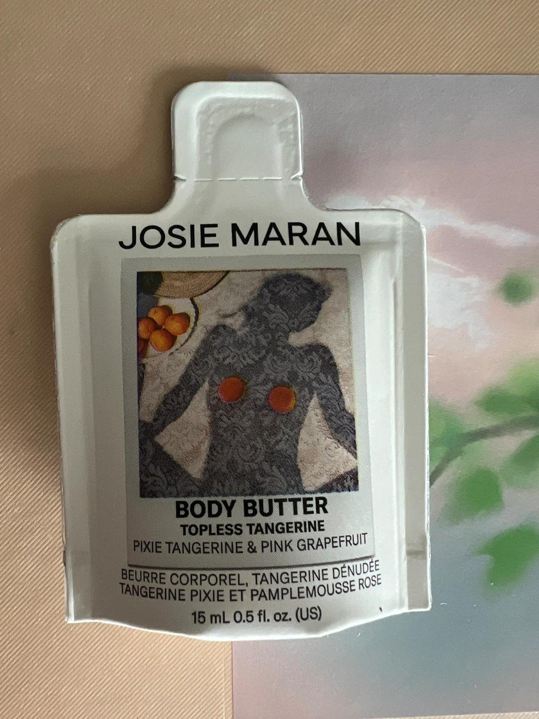 This is a sample of Josie Maran Whipped Argan Oil Body Butter in the Topless Tangerine scent. It's a travel-sized 15ml packet, perfect for trying out the product. It's formulated with argan oil and shea butter to moisturize your skin. Great for a quick pamper on the go!
