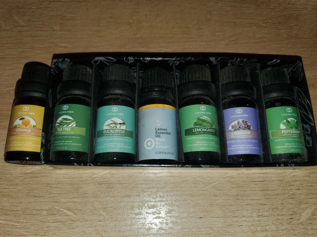 Set of six essential oils. Includes Orange, Tea Tree, Eucalyptus, Lemon, Lemongrass, Lavender, and Peppermint.