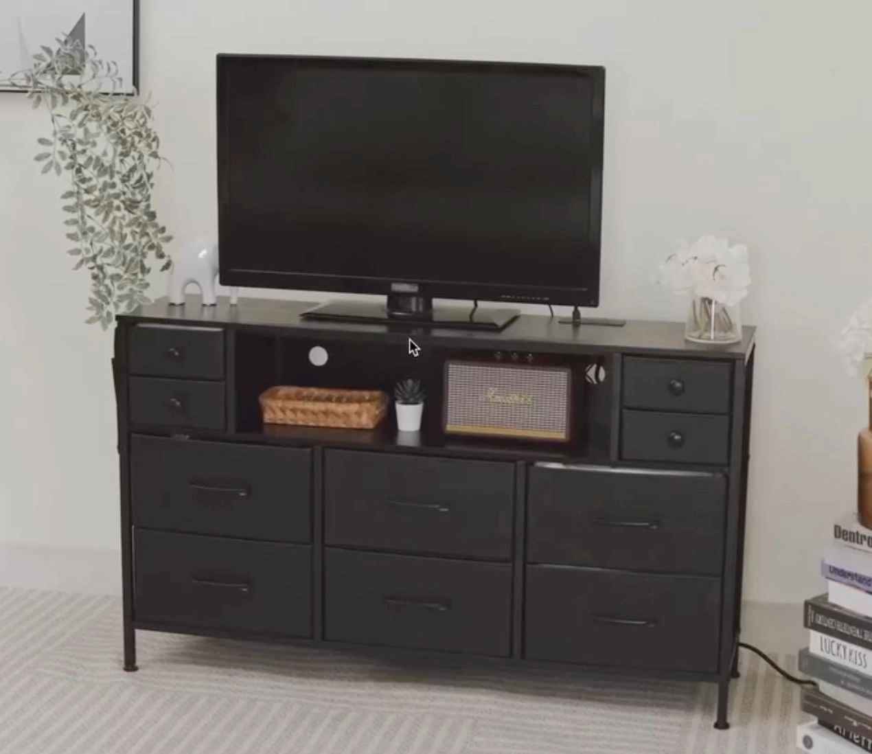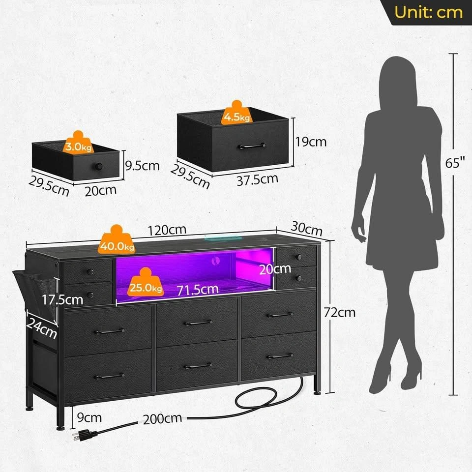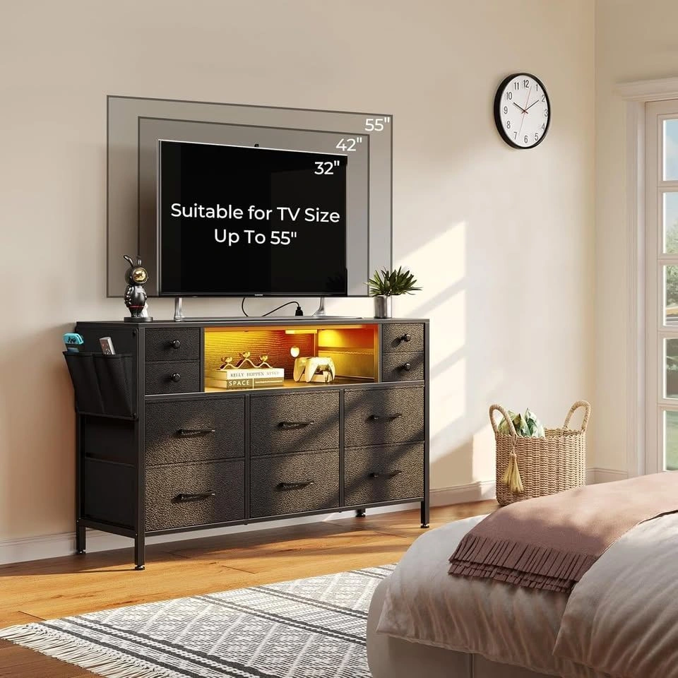 Rolanstar Dresser with Power Outlets and LED Lights, 10 Small Drawers Dresser with Side Pocket, Fabric Chest of Drawers with PU Finish, Wood Top for 55inch TV, Bedroom, Black, L
