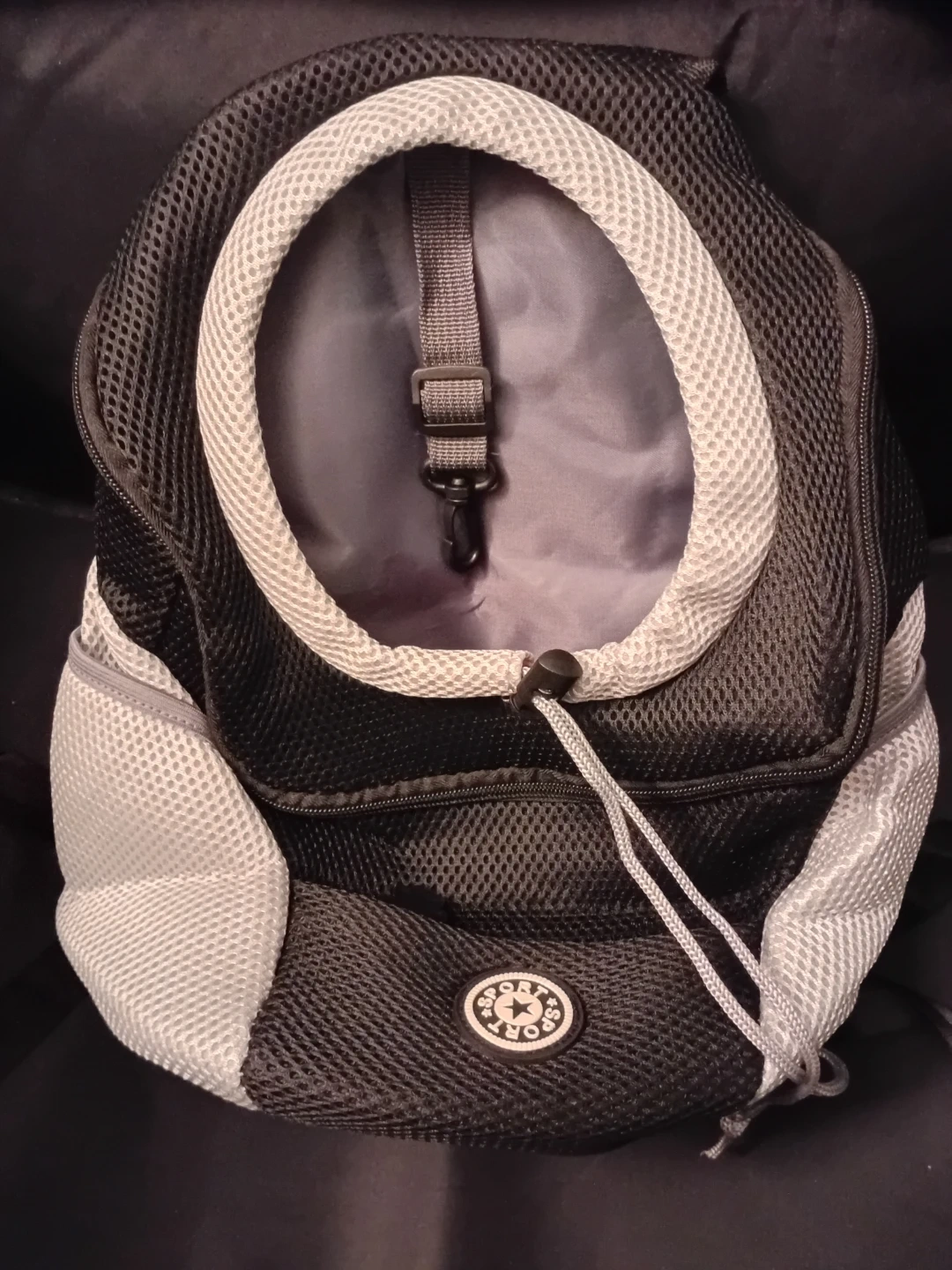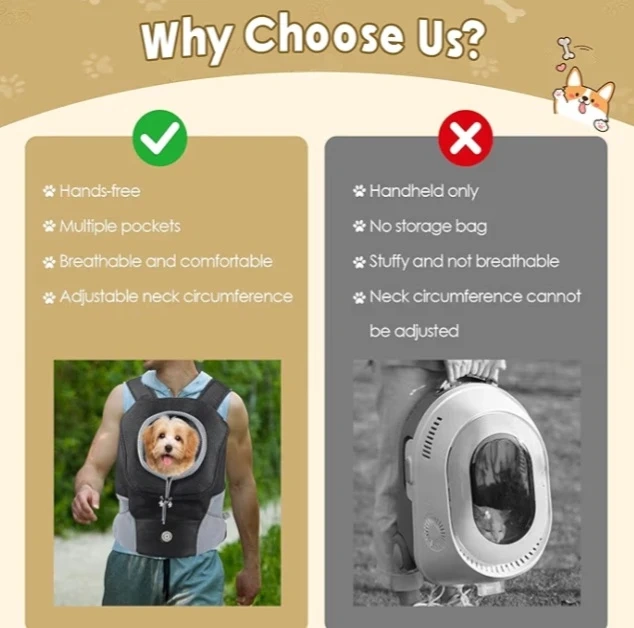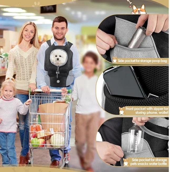This pet front carrier backpack is made with breathable mesh fabric. It features multiple pockets for storage, including a side pocket for poop bags and a front pocket with a zipper for your phone and wallet. An adjustable neck hole and safety belt ensure your pet stays secure. It's great for walks, hikes, or shopping trips!