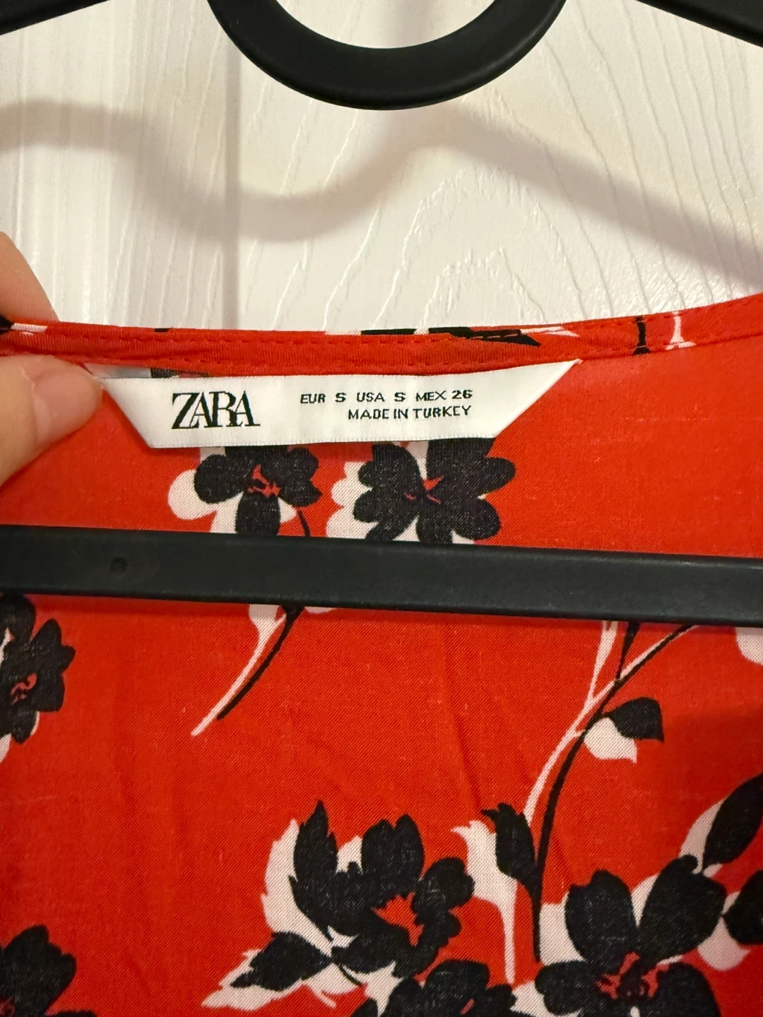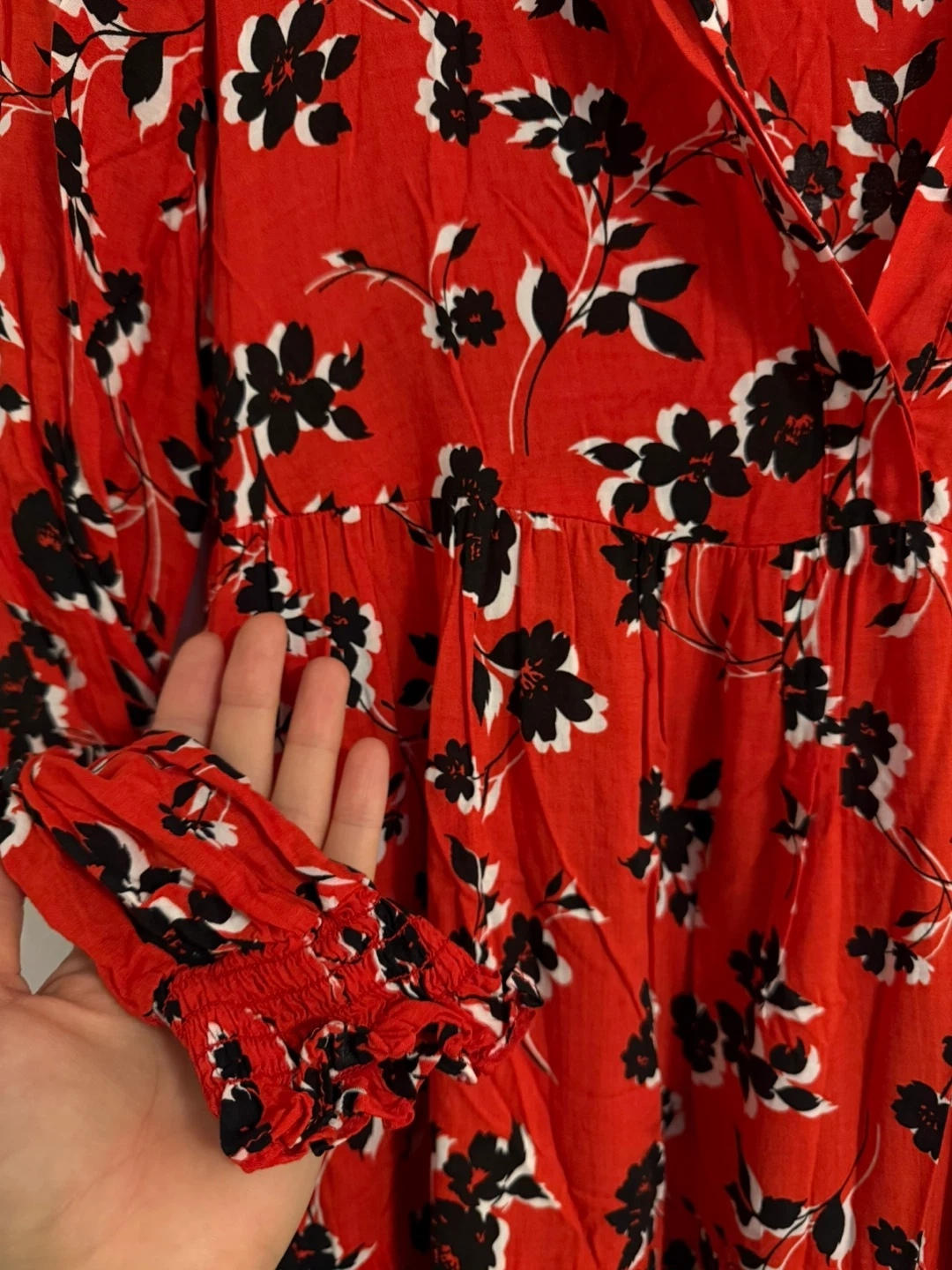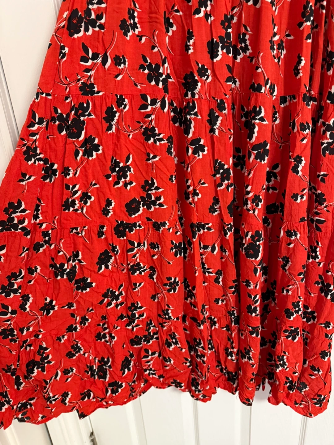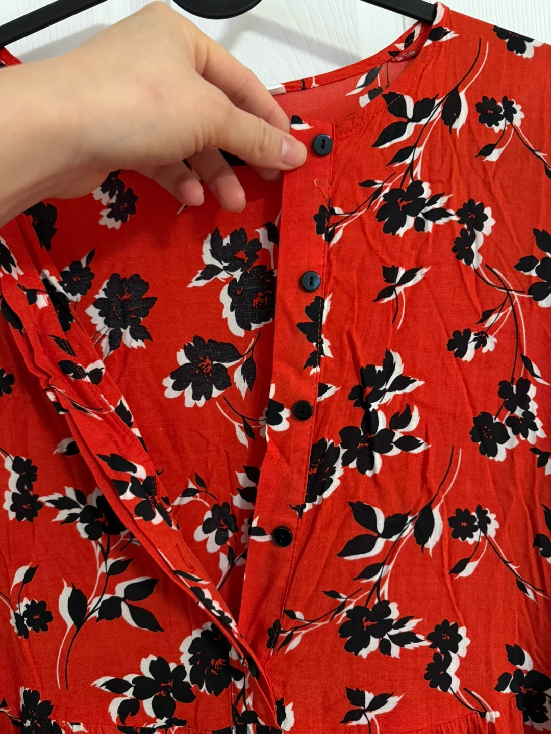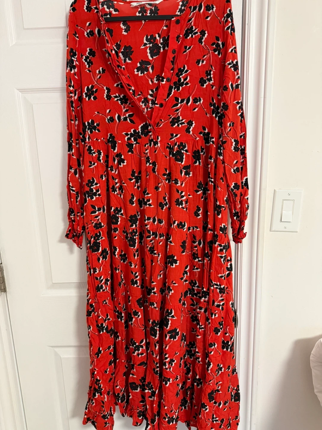 This is a red floral print midi dress from Zara. It features a V-neckline, button-down front, and a tiered skirt. Long sleeves with elasticated cuffs.