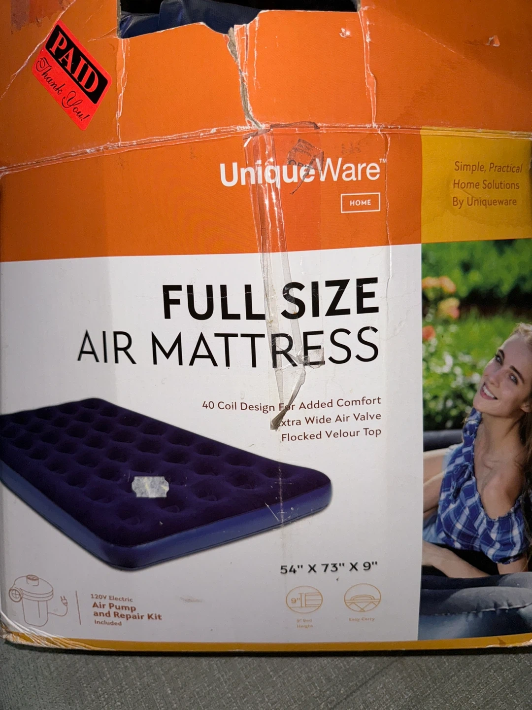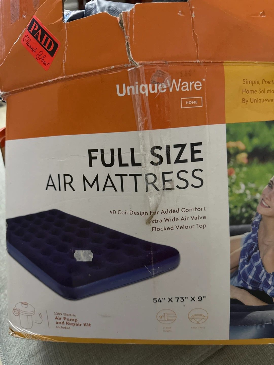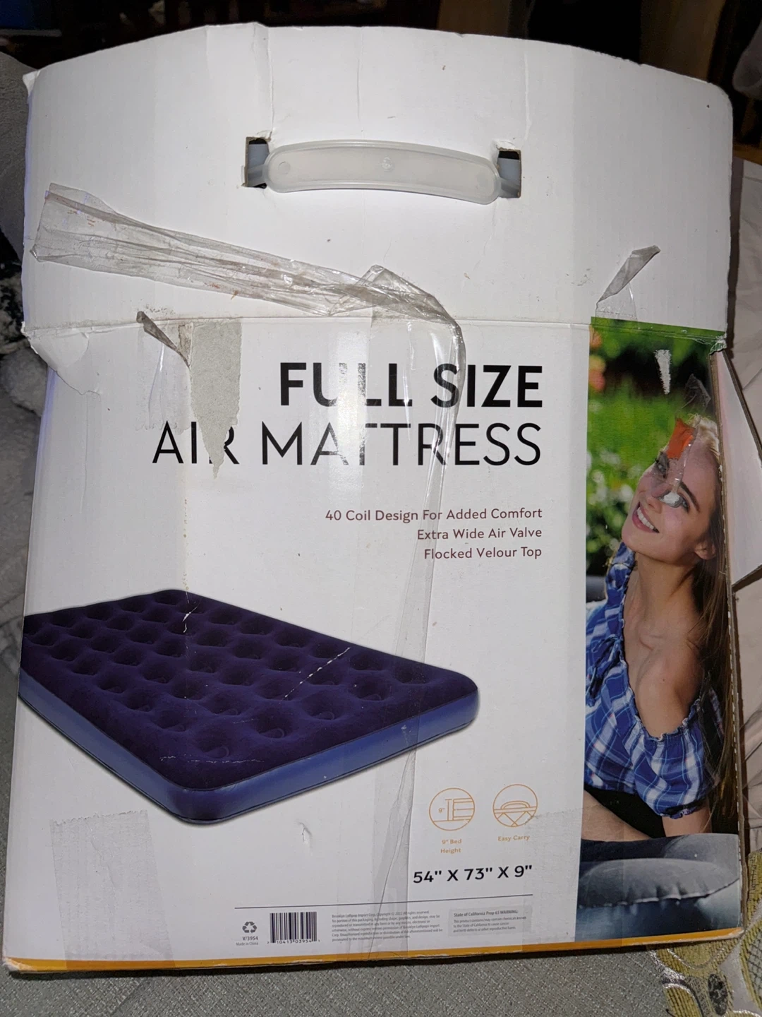 This is a full size air mattress with 40 coil design, extra wide air valve, and flocked velour top. It measures 54" x 73" x 9". A 120V electric air pump 🔺repair kit are not included.🔺 Perfect for guests or camping! Compact, portable and comfortable - our Deluxe full Air Bed provides the ultimate platform for a restful sleep. We start with heavy PVC material for durability and top it with a plush flocked surface for comfort. Internal coil beam waffle construction provides firm, responsive support and the dual function valve can be used for inflating or deflating the bed in a snap. Smoke Free home. Pick up/cash only.
