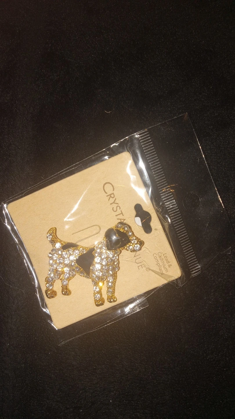 This Crystal Avenue brooch features a charming dog design, adorned with sparkling clear crystals and black accents. It's crafted to be lead and cadmium compliant. A lovely accessory for any outfit!