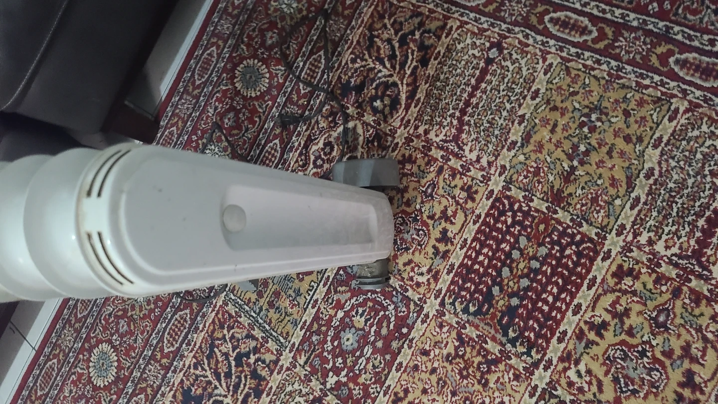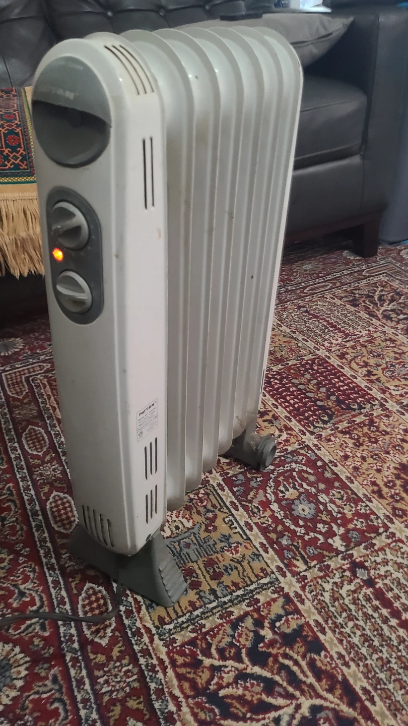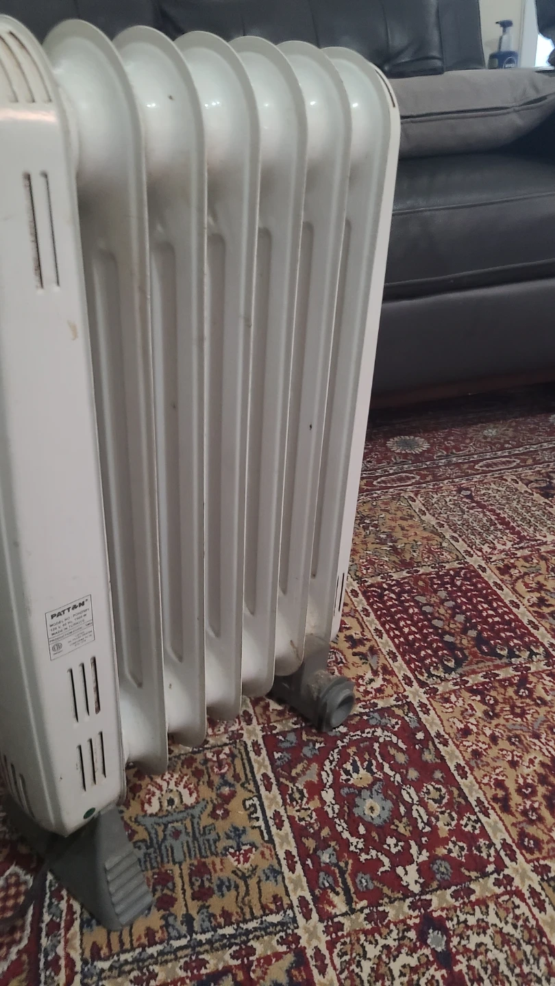 This is a Paten oil-filled radiator heater. It's a white, freestanding unit with multiple fins. It has a power indicator light on the front panel.one wheel is missing but it doesn't affect nothing or a couple of dollars in dollar store