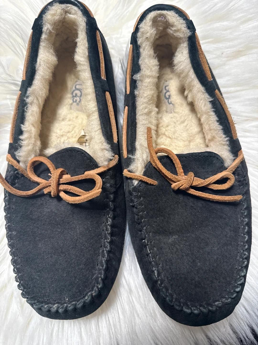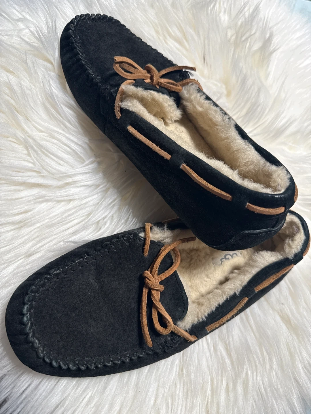 Selling a pair of UGG moccasins in black. They're a size 7 (US). These comfy shoes are in great shape and ready for a new owner!