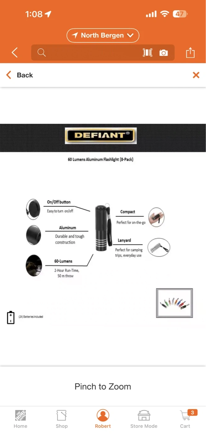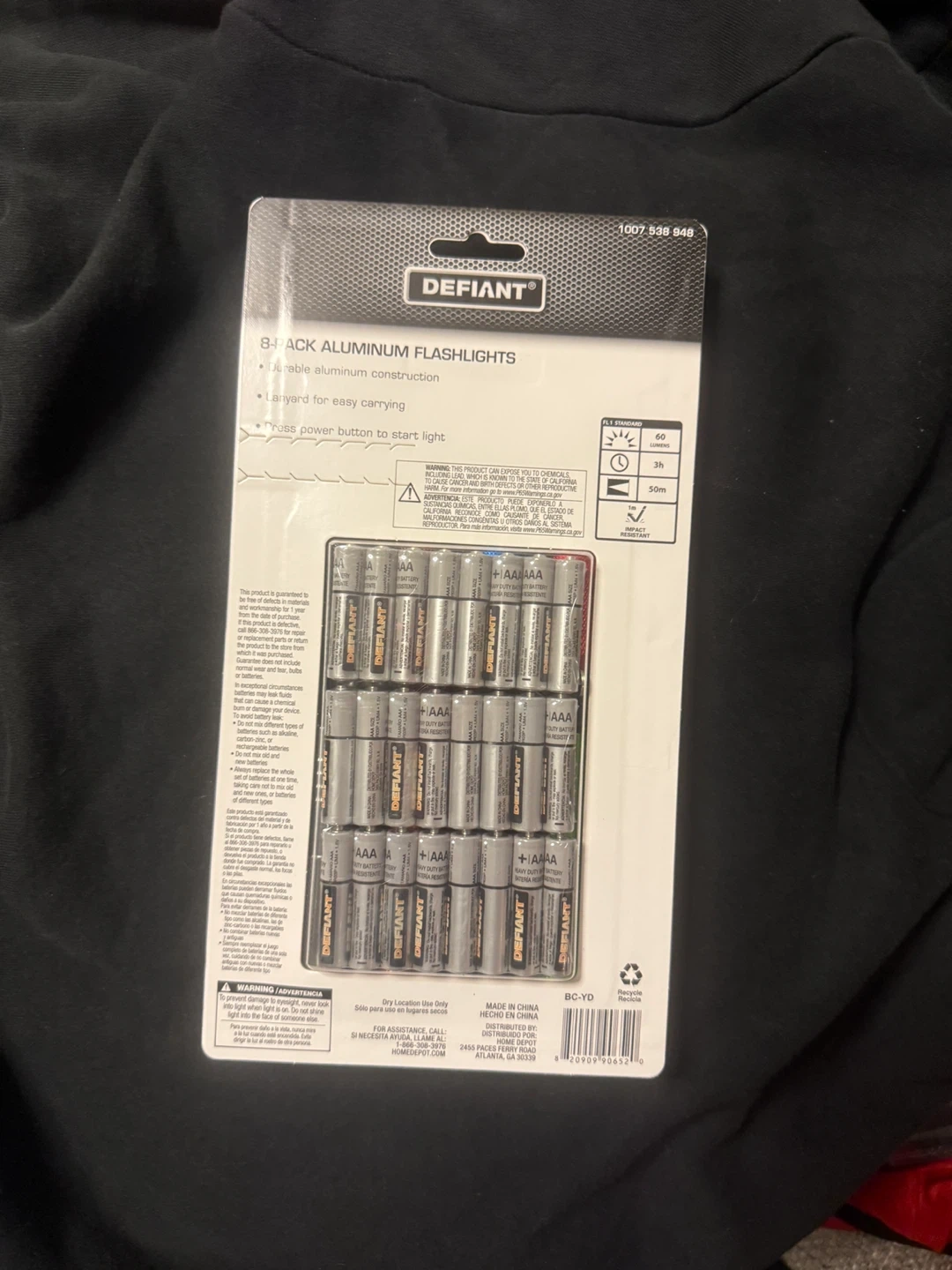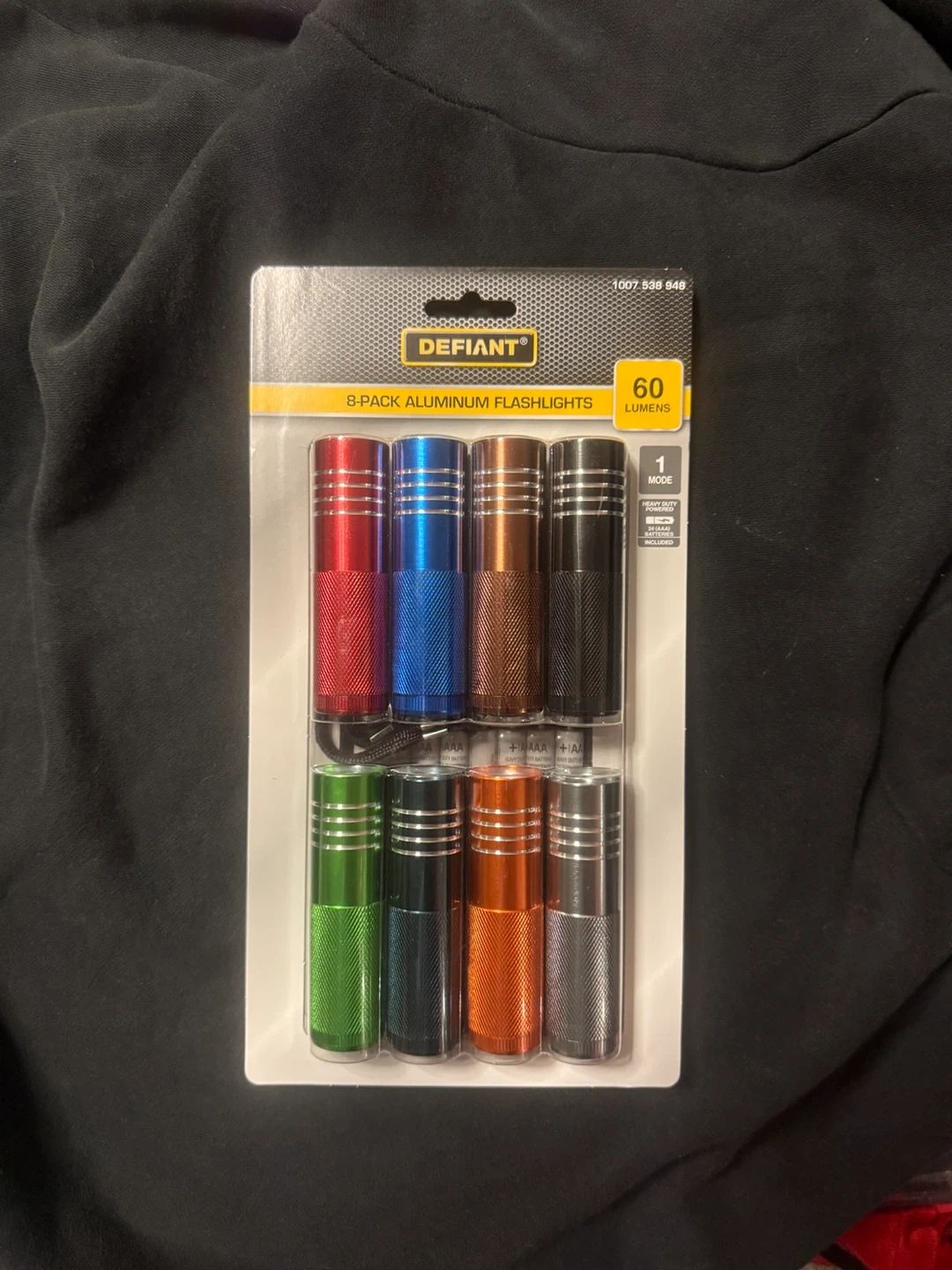 This is an 8-pack of Defiant aluminum flashlights. Each flashlight is made of durable aluminum and includes a lanyard for easy carrying. They're compact and perfect for camping trips or everyday use.