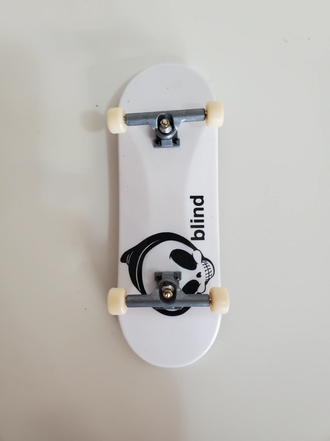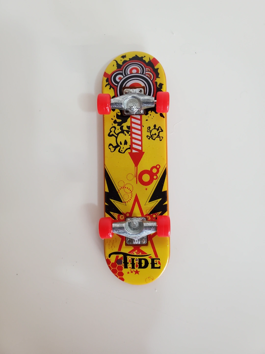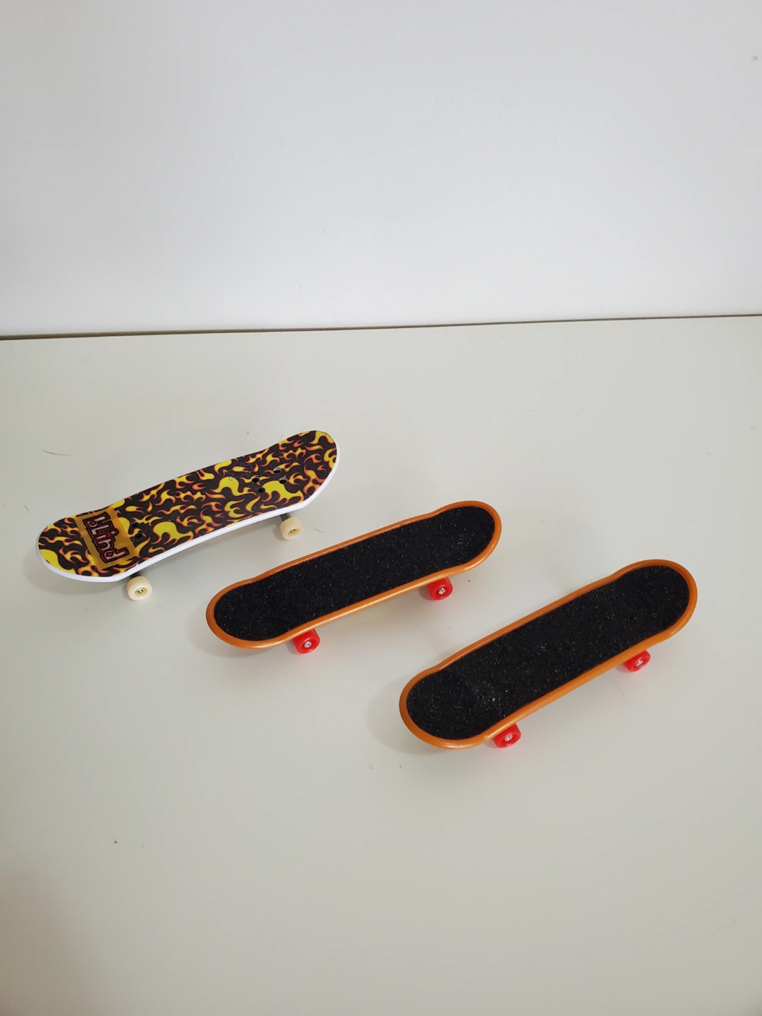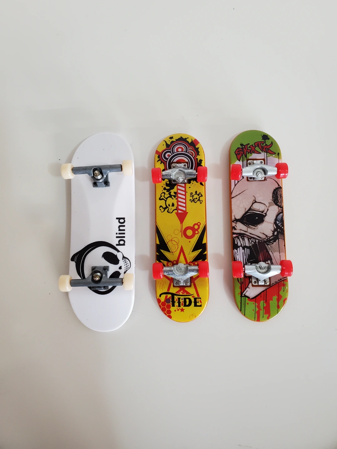 Collection of fingerboards. Includes three unique designs. One features a skull graphic, another has an abstract design, and the third has a monster graphic. Brands include Blind and Tide. Great for collectors or casual play.