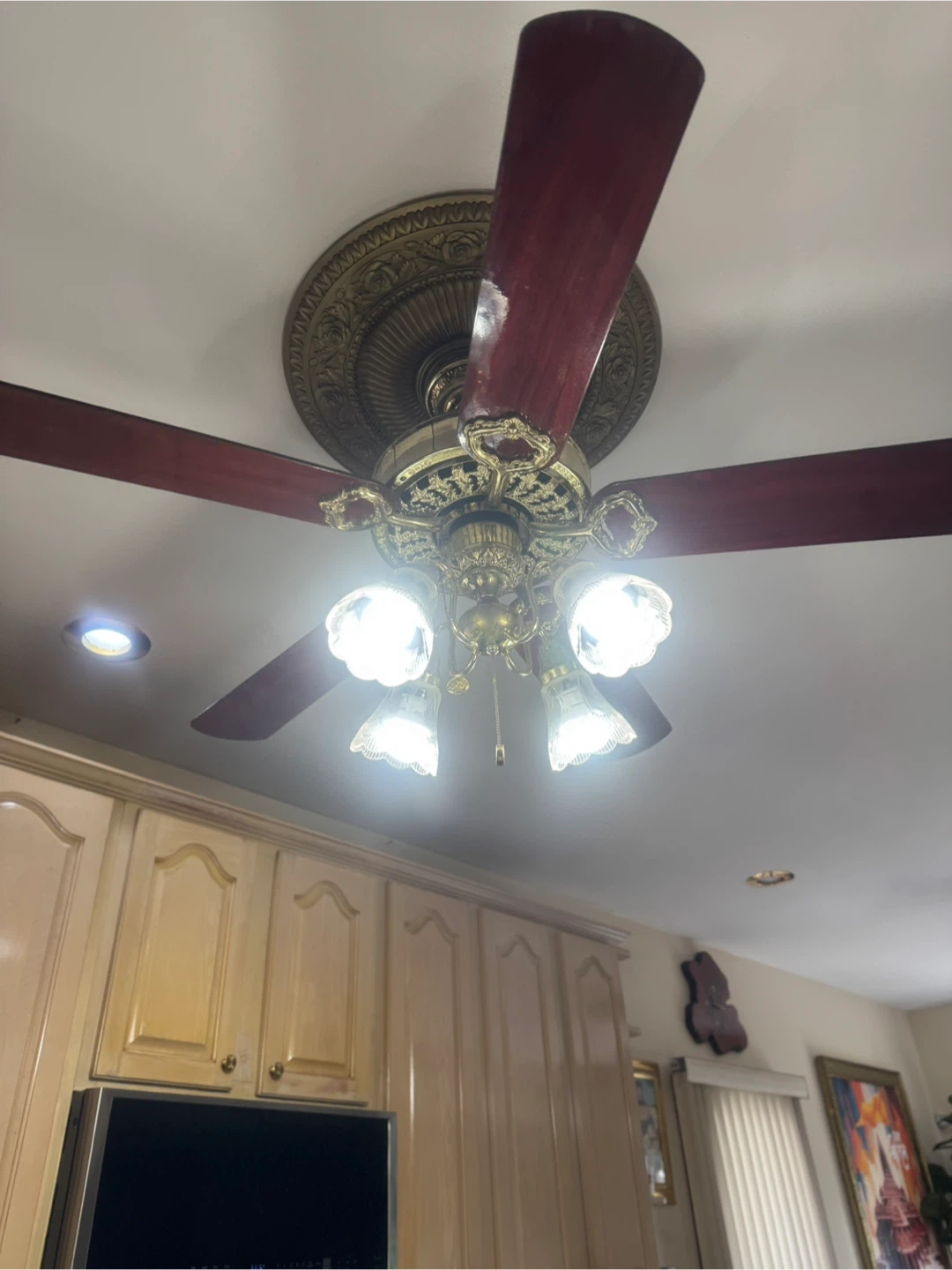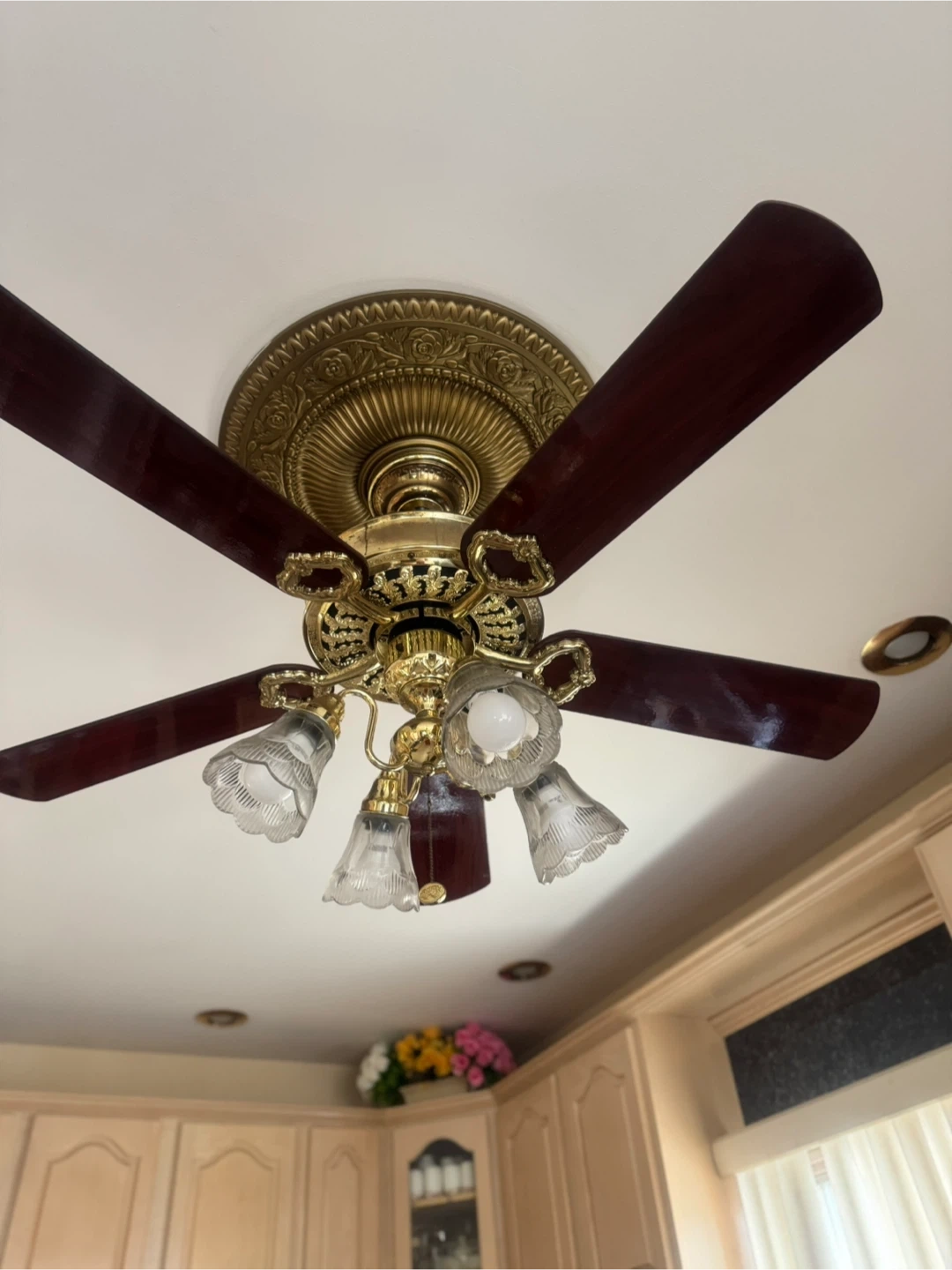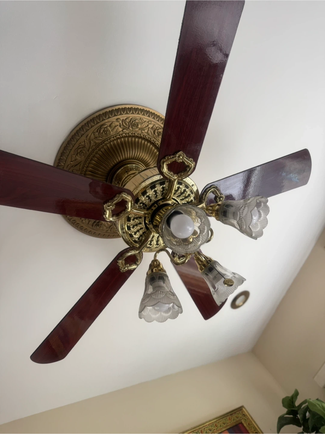 Selling a ceiling fan with attached lights. It has a gold-colored base and dark wood-colored fan blades. The light fixtures are clear glass.