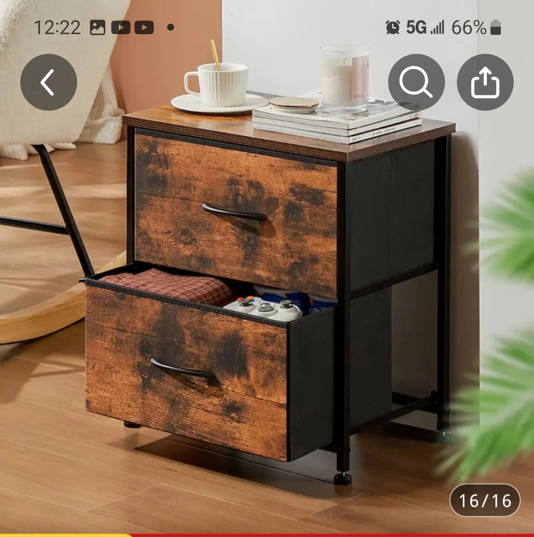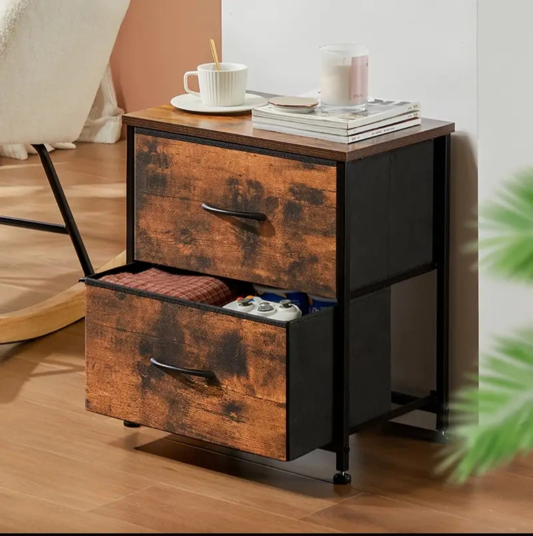 Selling a nightstand with two storage drawers! It has a rustic brown finish and is in the box, unopened . Perfect for adding some extra storage next to your bed or as a small end table in any room. The box is included!