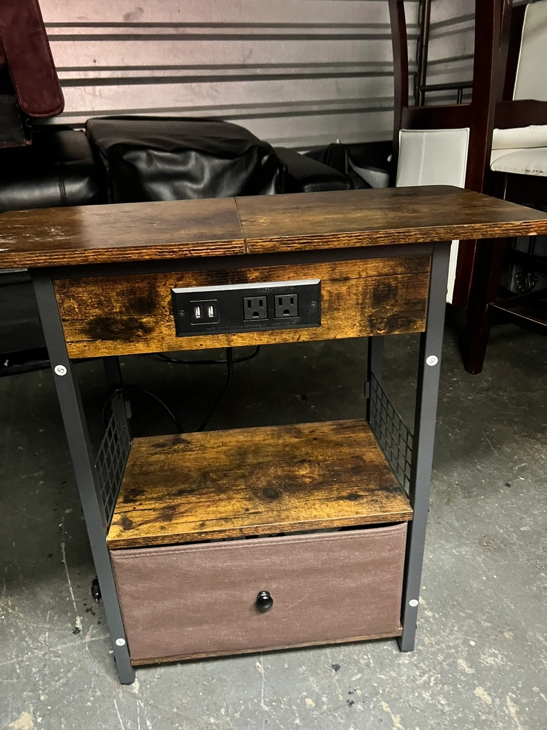 Small nightstand, brown wood top, black metal frame. Features built-in power strip with USB ports and outlets. One fabric drawer included. Great for small spaces.
