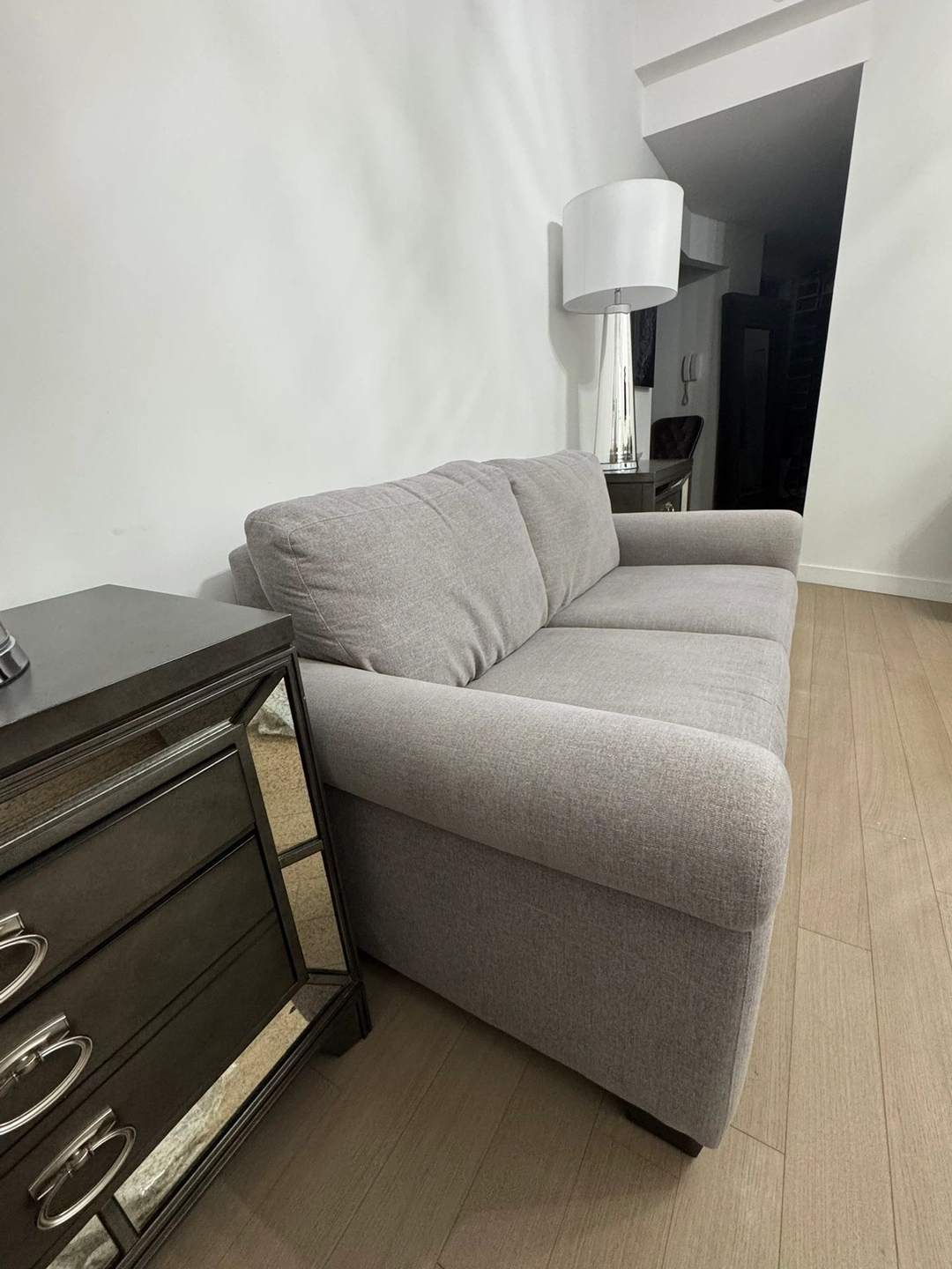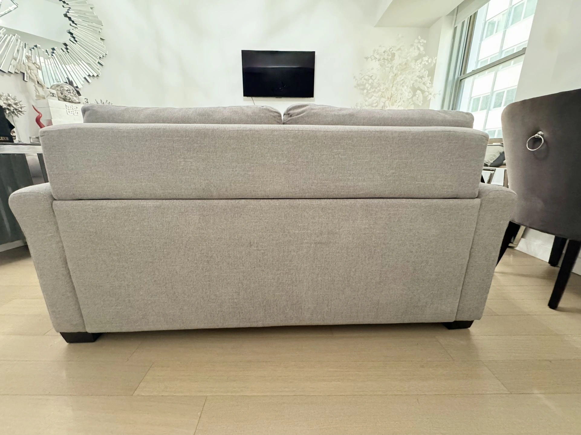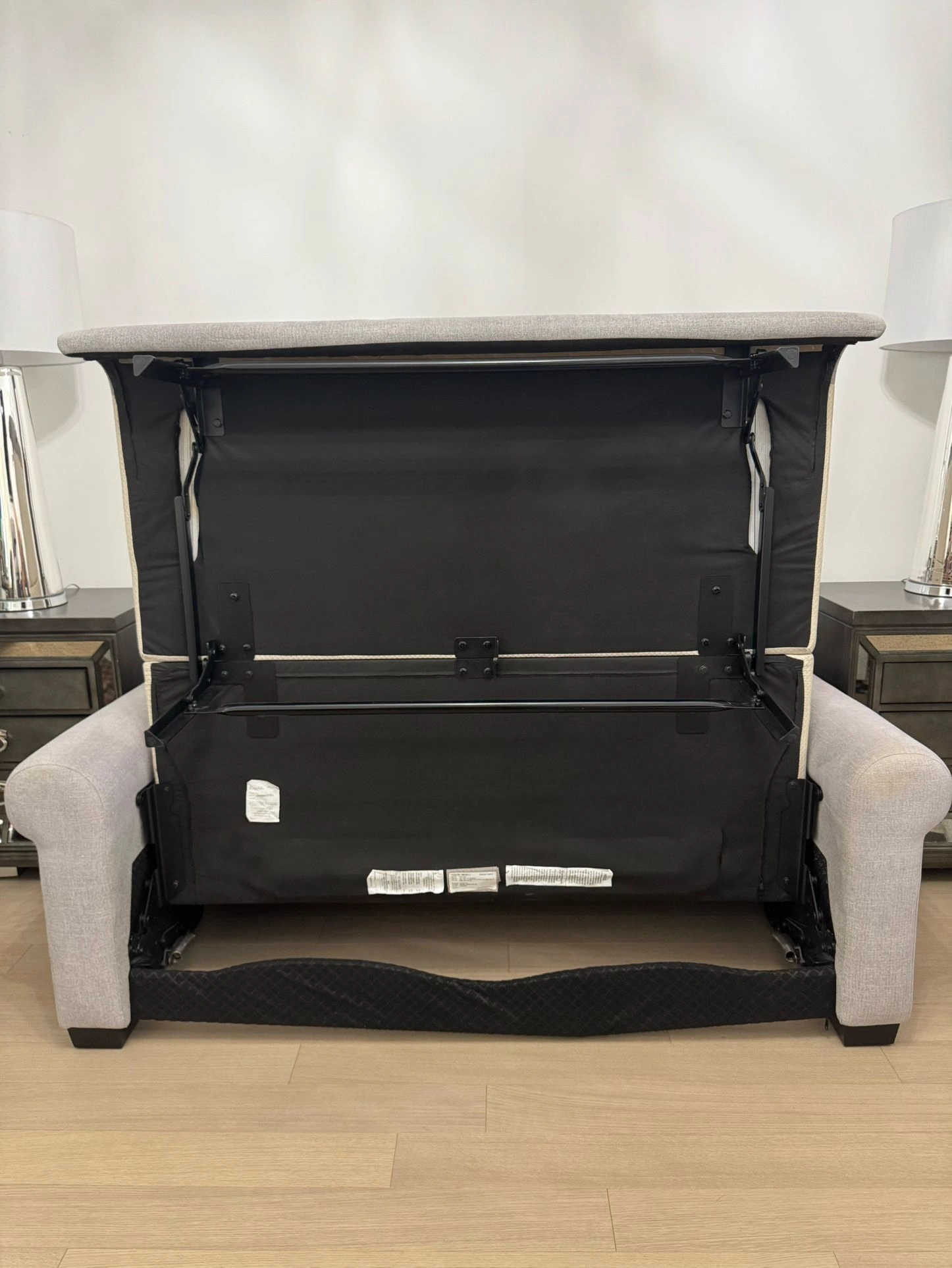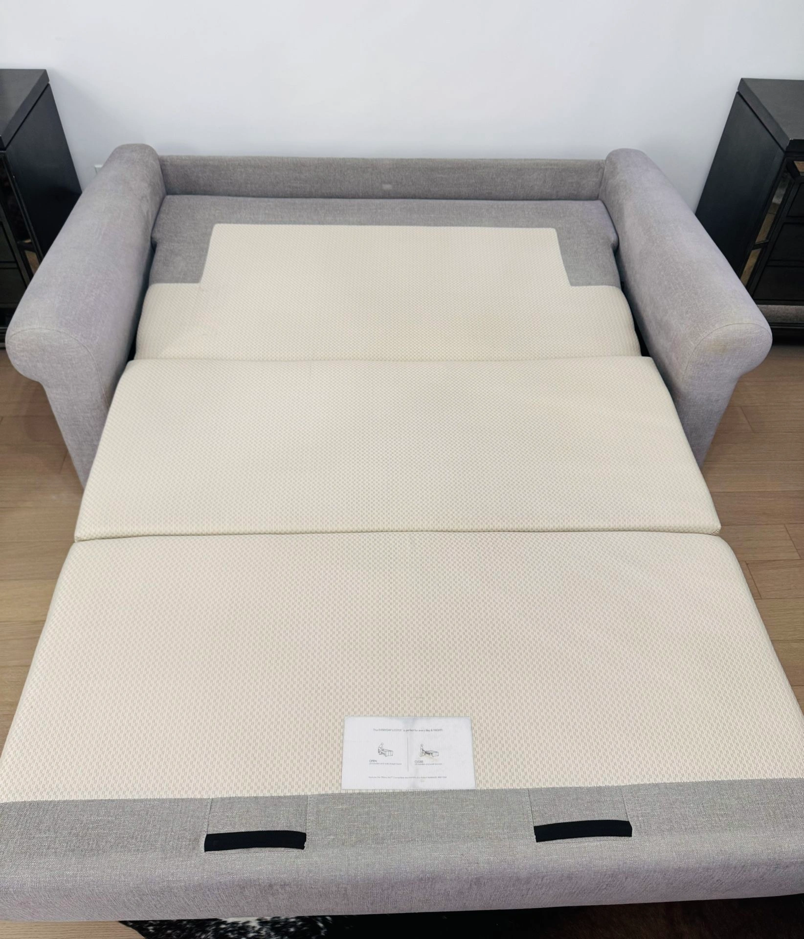 15Fabric upholstery, gray color. Seat cushion is 100% fabric. Features matt black steel, auto-fold legs. Contemporary style sofa-bed with 2 seats. Performance fabric is heavy duty, moisture repellent, and stain resistant. Full bed dimensions (opened): 54”W x 80”D. Total Depth Open: 80”D. Seat wide: 29”. Seat depth: 26”. Arm height: 25.5”. Arm depth: 38.5”. 4” durable spring mattress for comfort, similar to a pocket coil innerspring mattress. Color: Gray Material: Fabric Item Width: 50-54 in Brand: Jennifer Item Depth: Over 60 in Seating Capacity: Up to 2