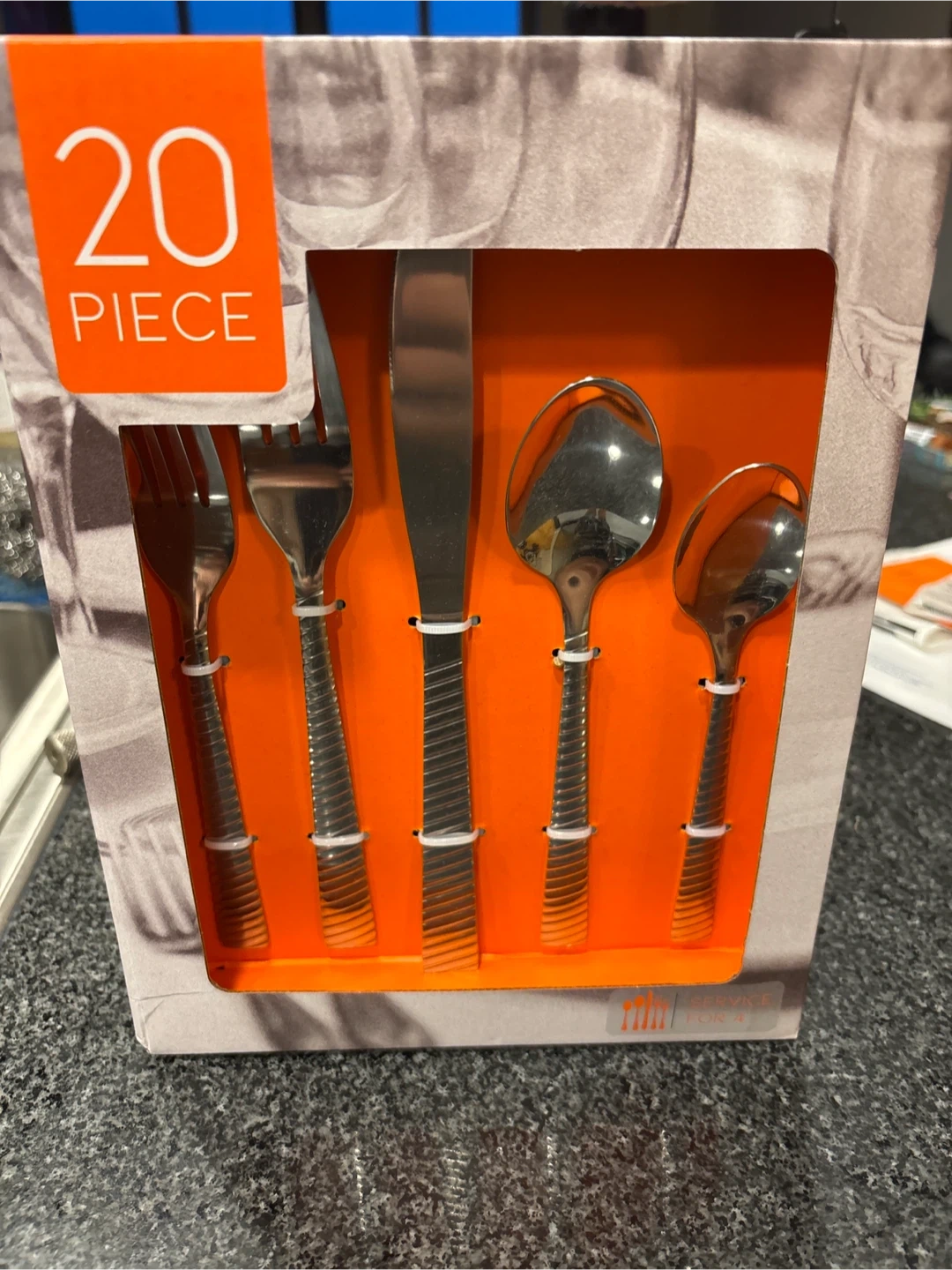 I'm selling a 20-piece flatware set that serves 4 people. The set includes forks, knives, tablespoons, and teaspoons. It's still in its original packaging!