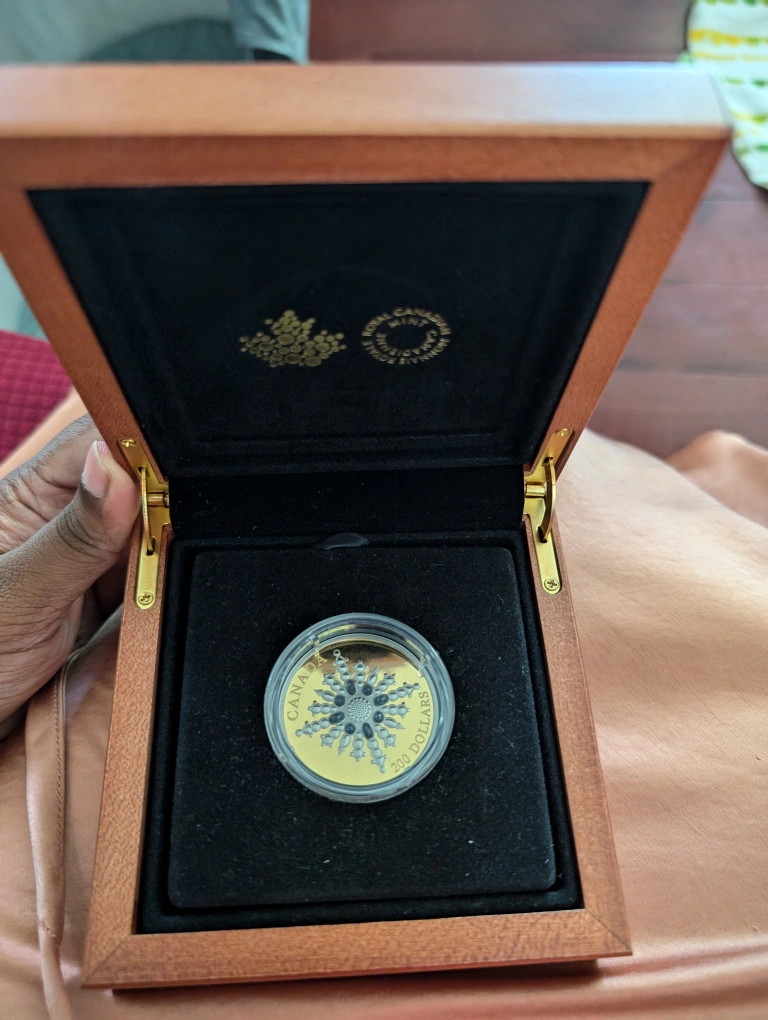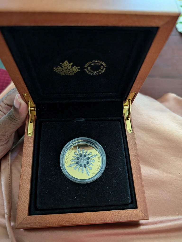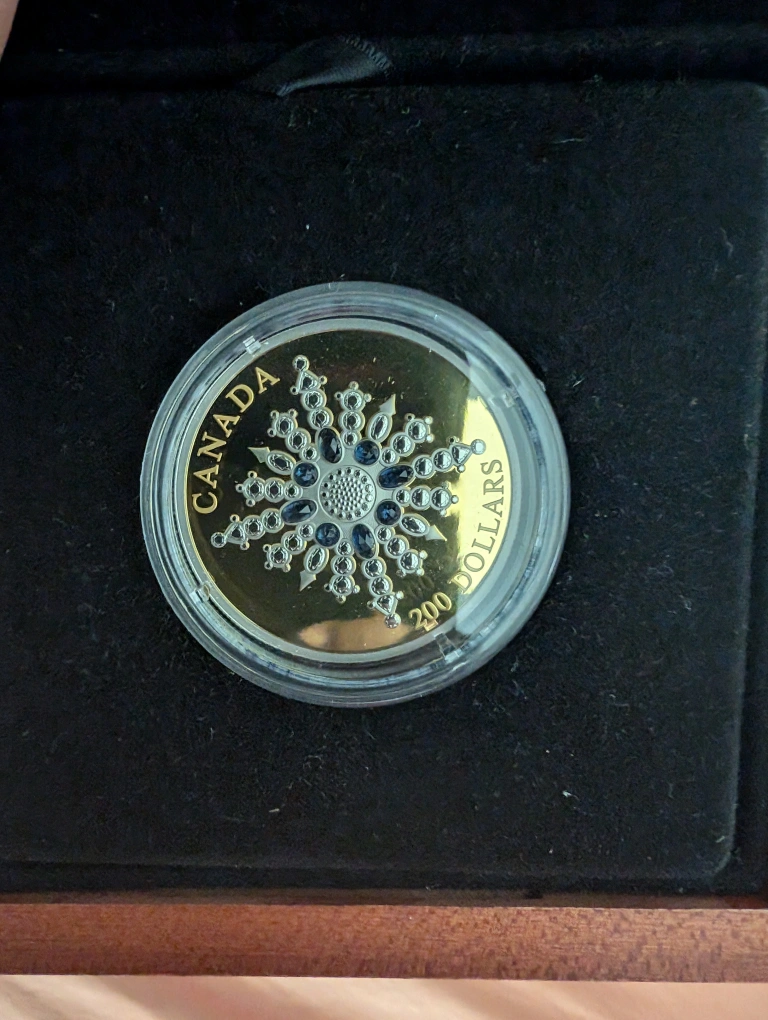 96$200 Pure Gold Coin – The Sapphire Jubilee Snowflake Brooch https://www.mint.ca/en/shop/coins/2024/pure-gold-coin-the-sapphire-jubilee-snowflake-brooch Only 250 in circulation. This is out of stock everywhere. Open to hear offers!