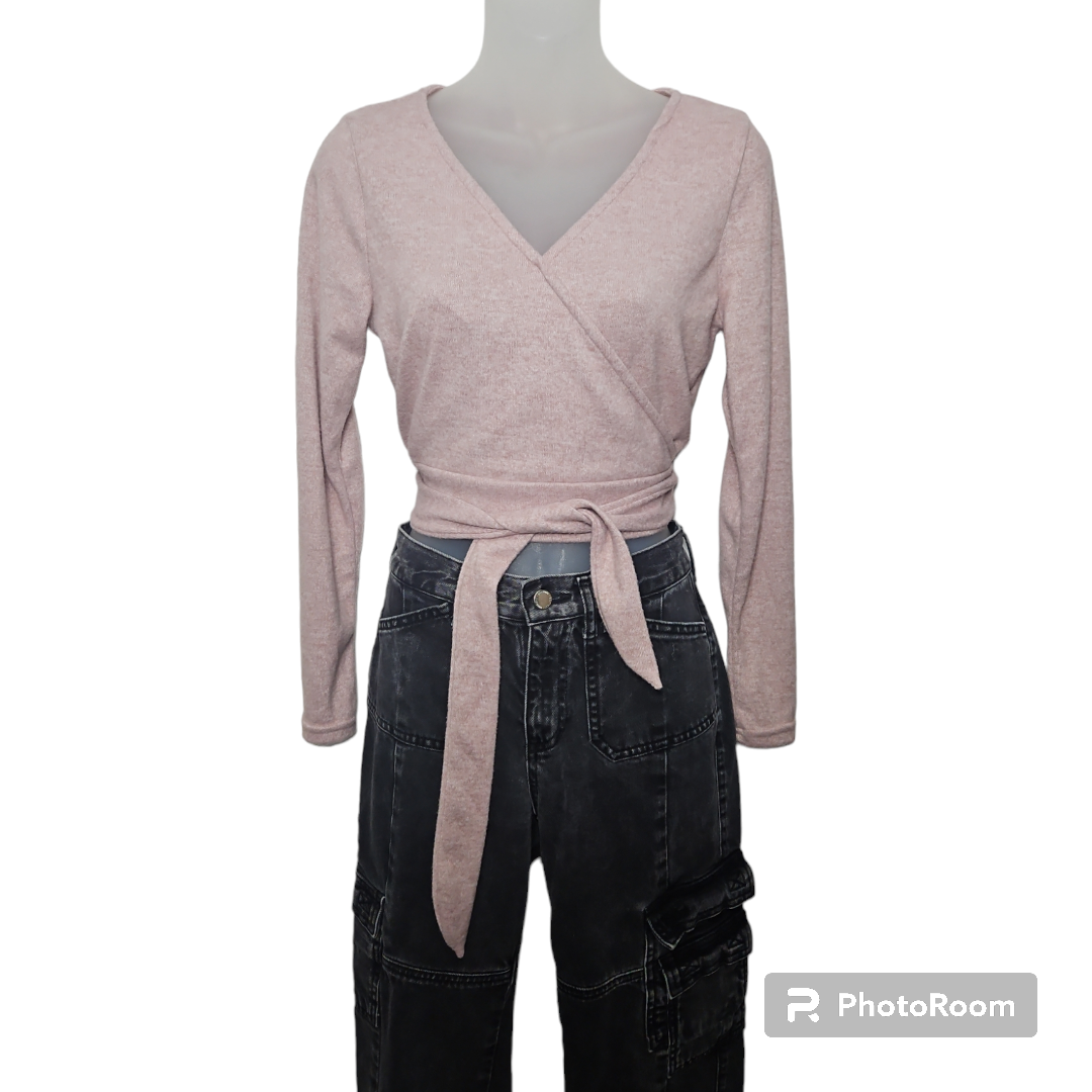 no comment Heather pink faux wrap cropped top with 2 ties on the side. So soft, cozy & lightweight.