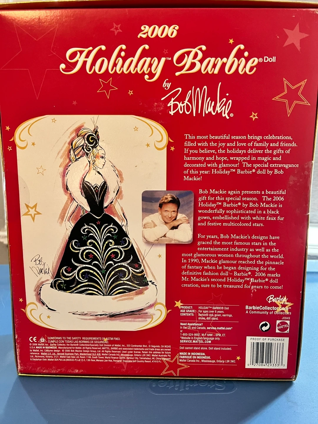10Selling a 2006 Holiday Barbie Doll by Bob Mackie. This beautiful doll is new in box and makes a special gift for this season. The doll is specially sophisticated in a black gown, embellished with white faux fur and festive multicolored stars. A collector's item for ages 6+