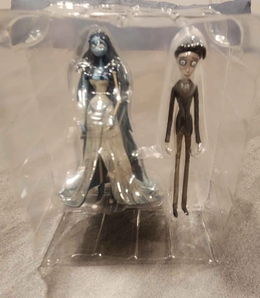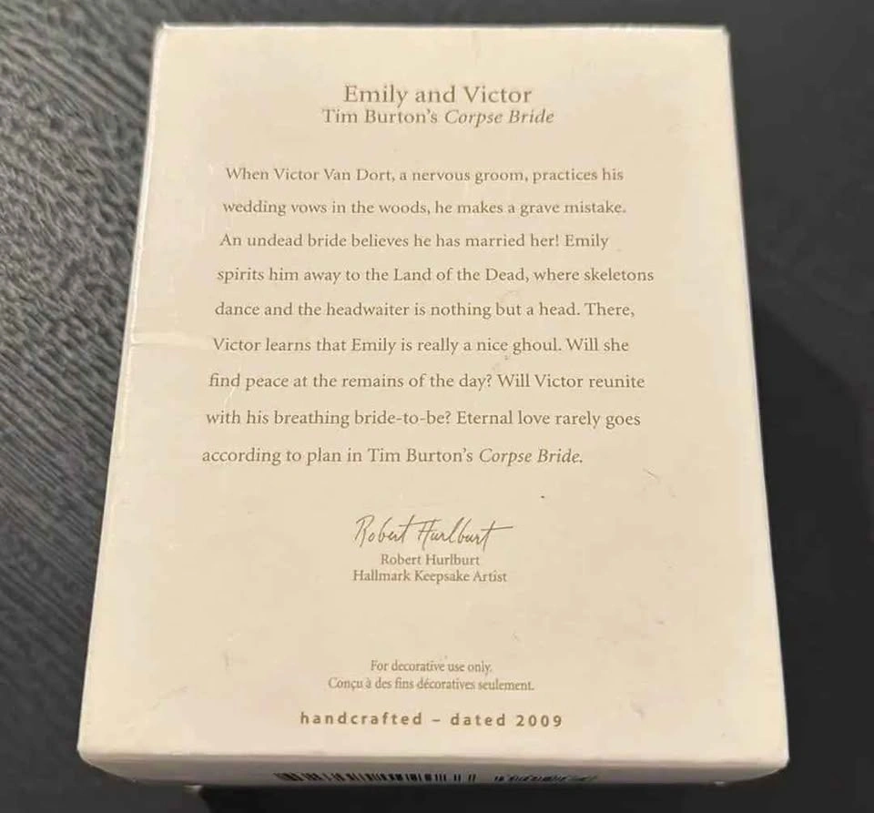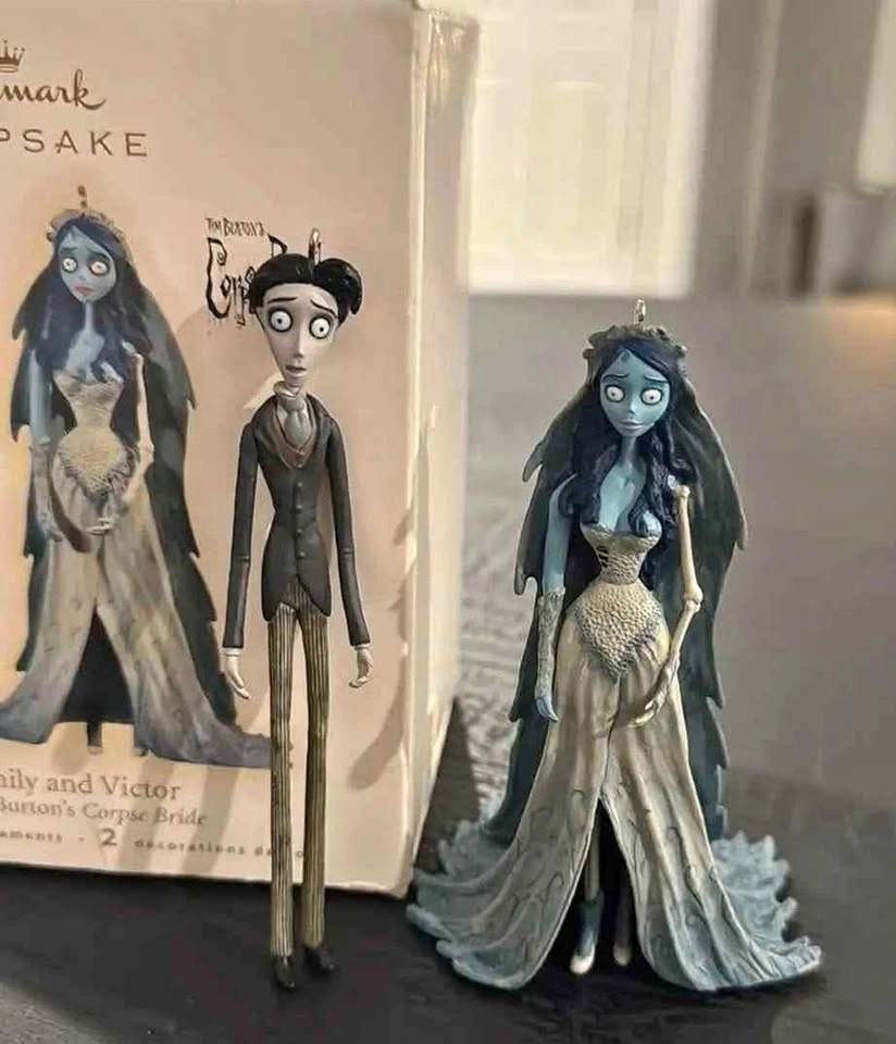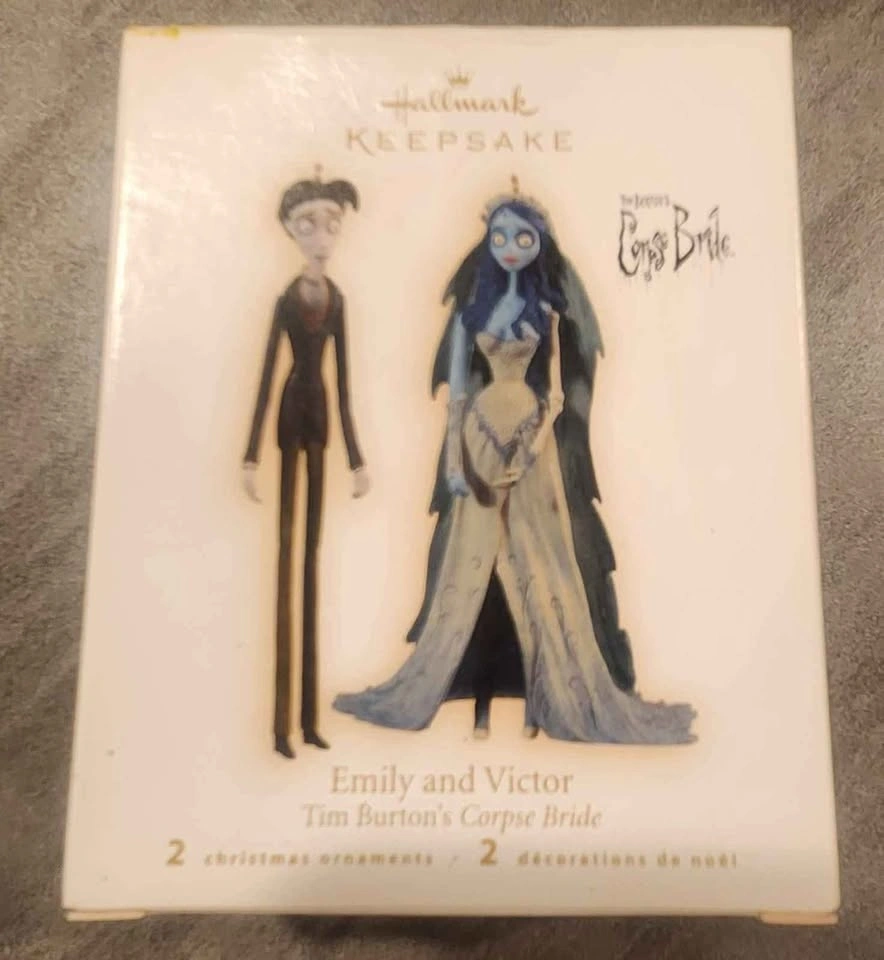 The 2009 Hallmark Emily and Victor Tim Burton's Corpse Bride Ornament Keepsake is a small plastic ornament featuring characters from Tim Burton's film "Corpse Bride." This irregular-shaped ornament includes two pieces, depicting Emily and her groom, Victor. Perfect for Halloween or Christmas, this collectible item is a part of the Hallmark Ornaments collection and can be hung for display. Made in 2009, this ornament is a unique addition for fans of the film or collectors of holiday decor. Removed from box for pictures, excellent shape. Figures have never been hung. More pics available upon request. Listing will be removed when sold. If you're interested; please write something in addition to the "is this available?" post. I will not respond otherwise.