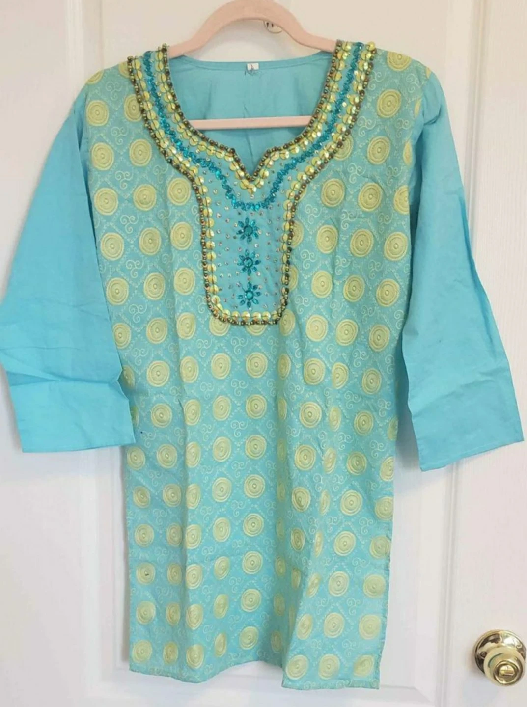 New, cotton kurti / short top for girls with lots of thread and sequins work in front from India.