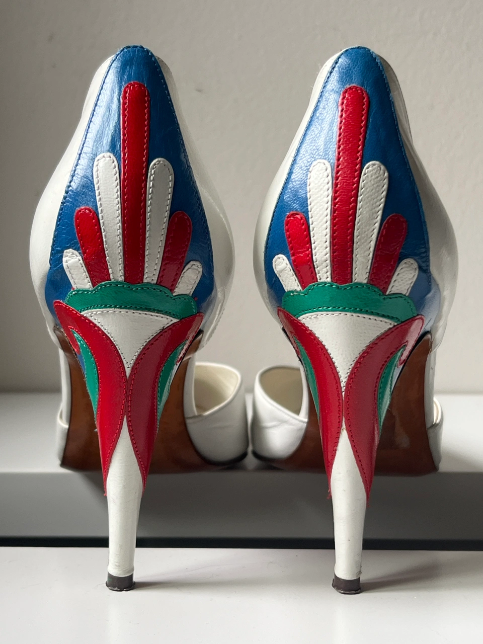 Made with beautiful craftsmanship these heels are here for the one who thrives on unique style. In the 15 years of owning these I’ve paired with a royal blue velour jumpsuit to jeans and t-shirt and red blazer. Although I see these as art on their own, they are way too gorgeous not to be out there having fun with someone else!