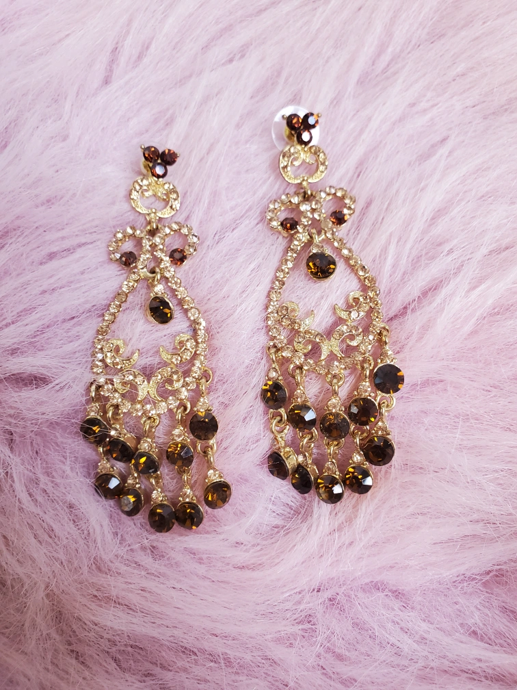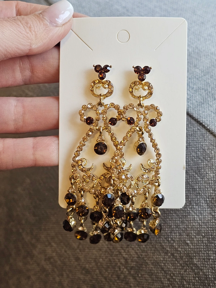 Brand new Gorgeous Chandelier Earrings with amber, gold, and brown crystal stones. 3.5" long. Light weight! Perfect for a wedding or fancy evening. Smoke free, pet free home 🏠 Please see my other listings! I'm happy to bundle items and give sweet deals! πŸ›
