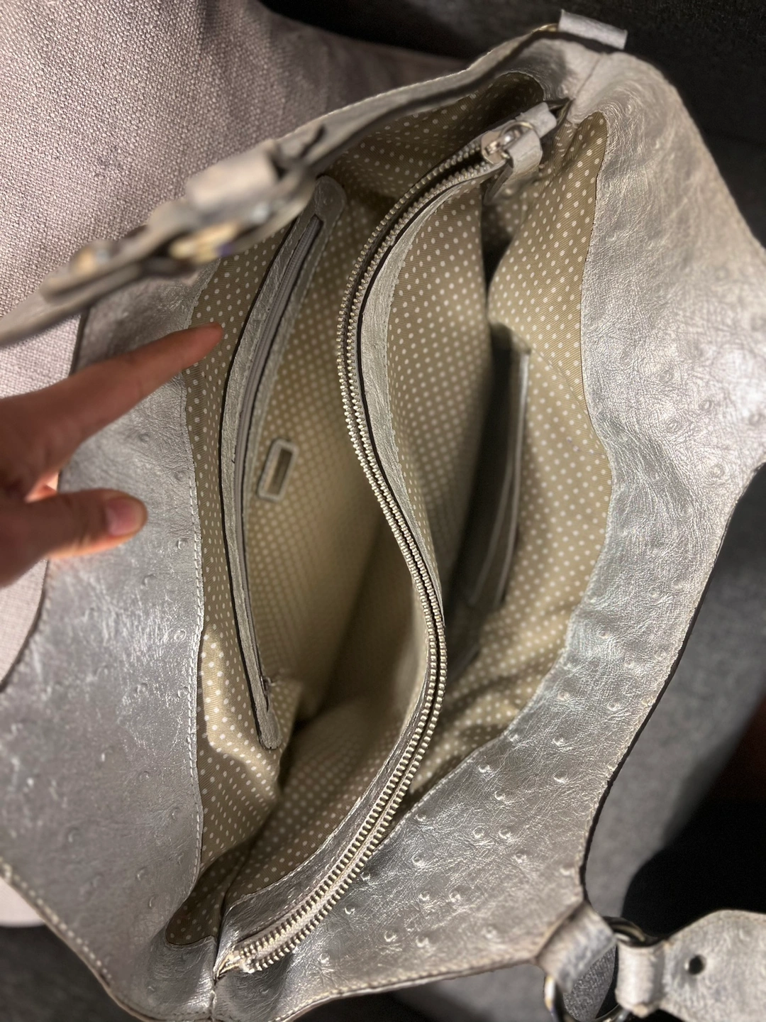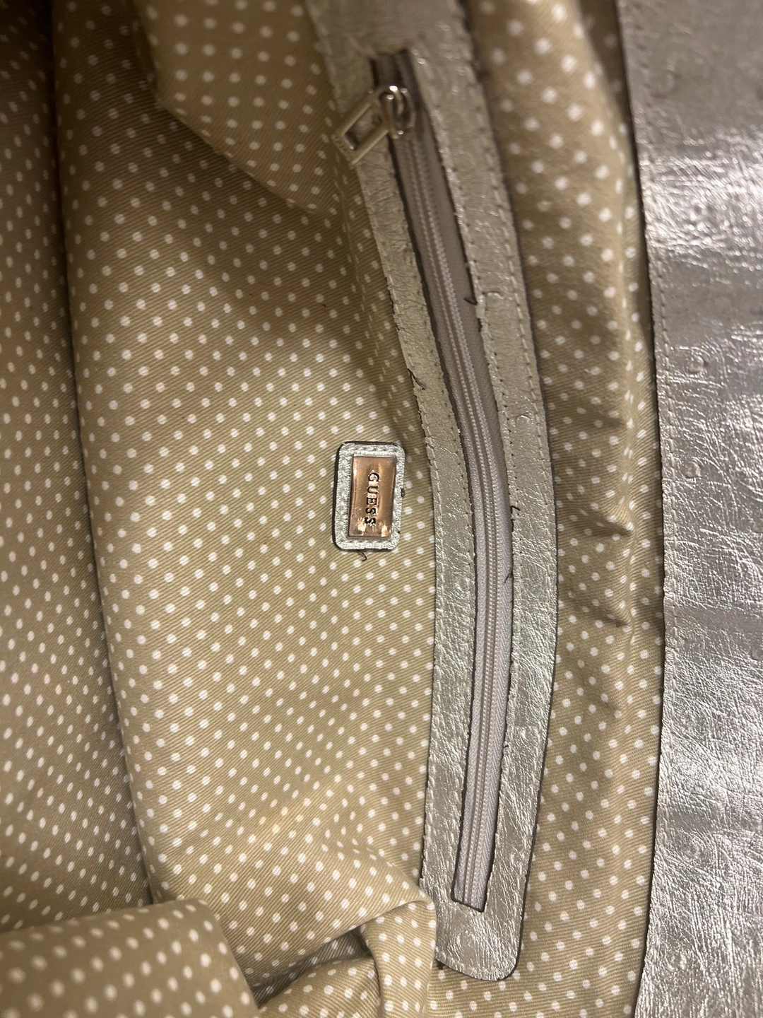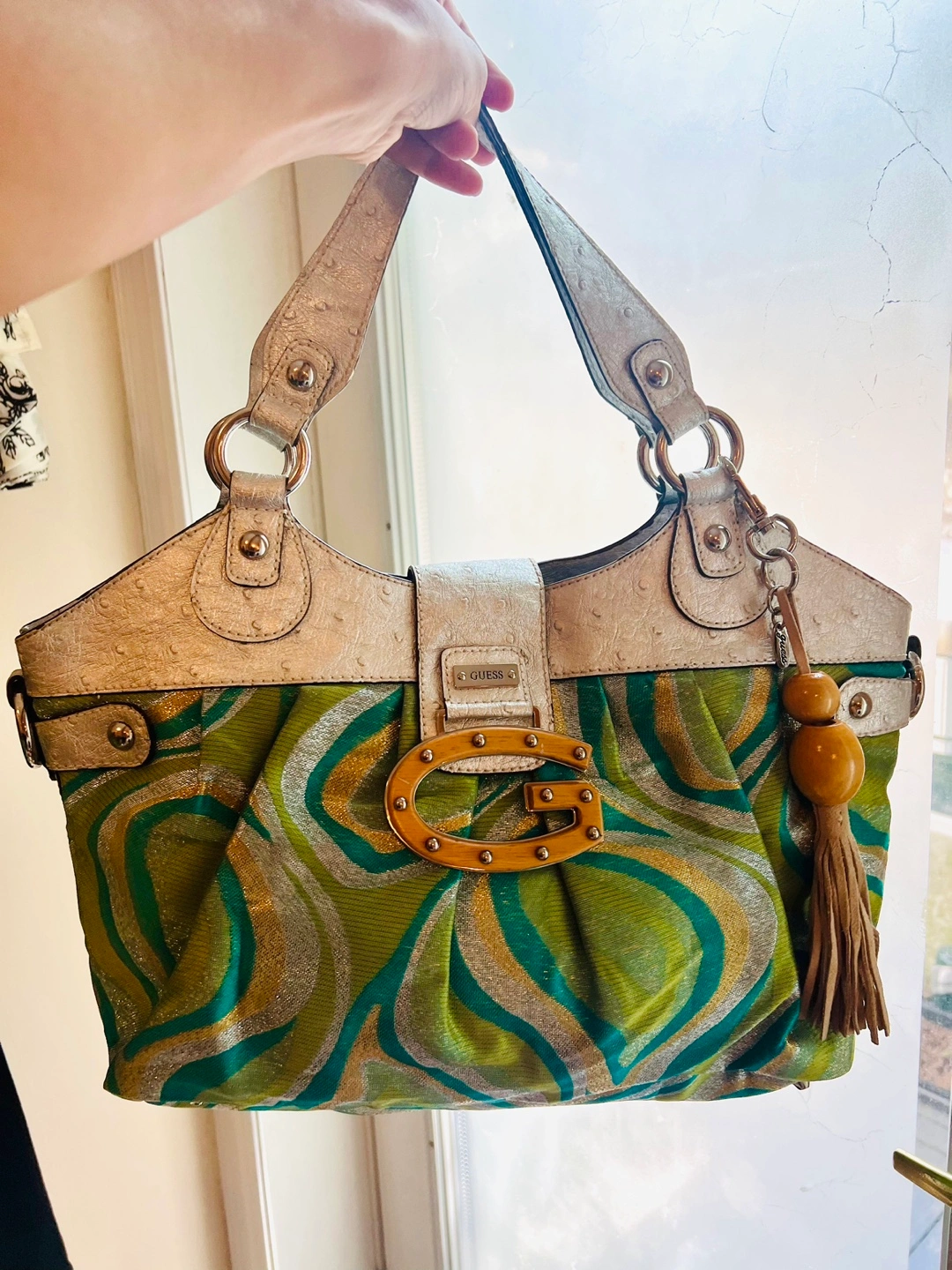 Large bag with 3 inside compartments. Like new. Bright colors for vacation. No rips or scratches. Green and silver. Unique bought in Vegas. Retail price $125