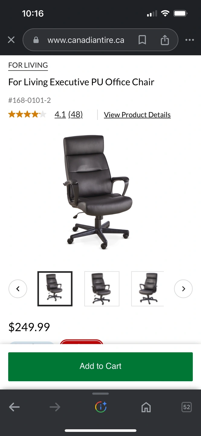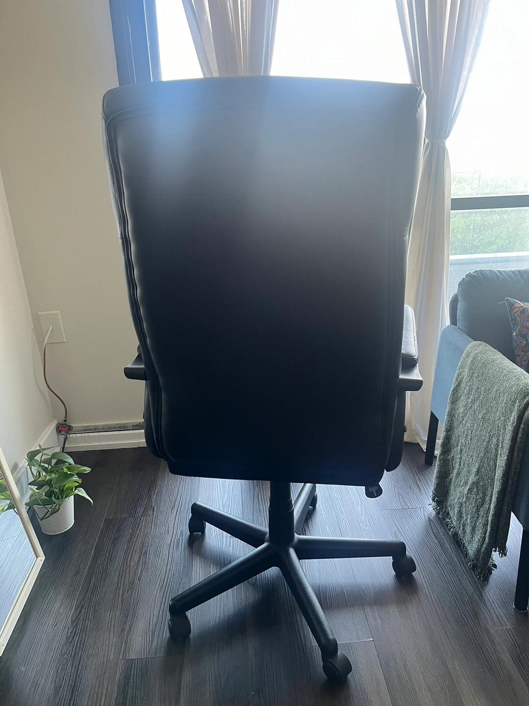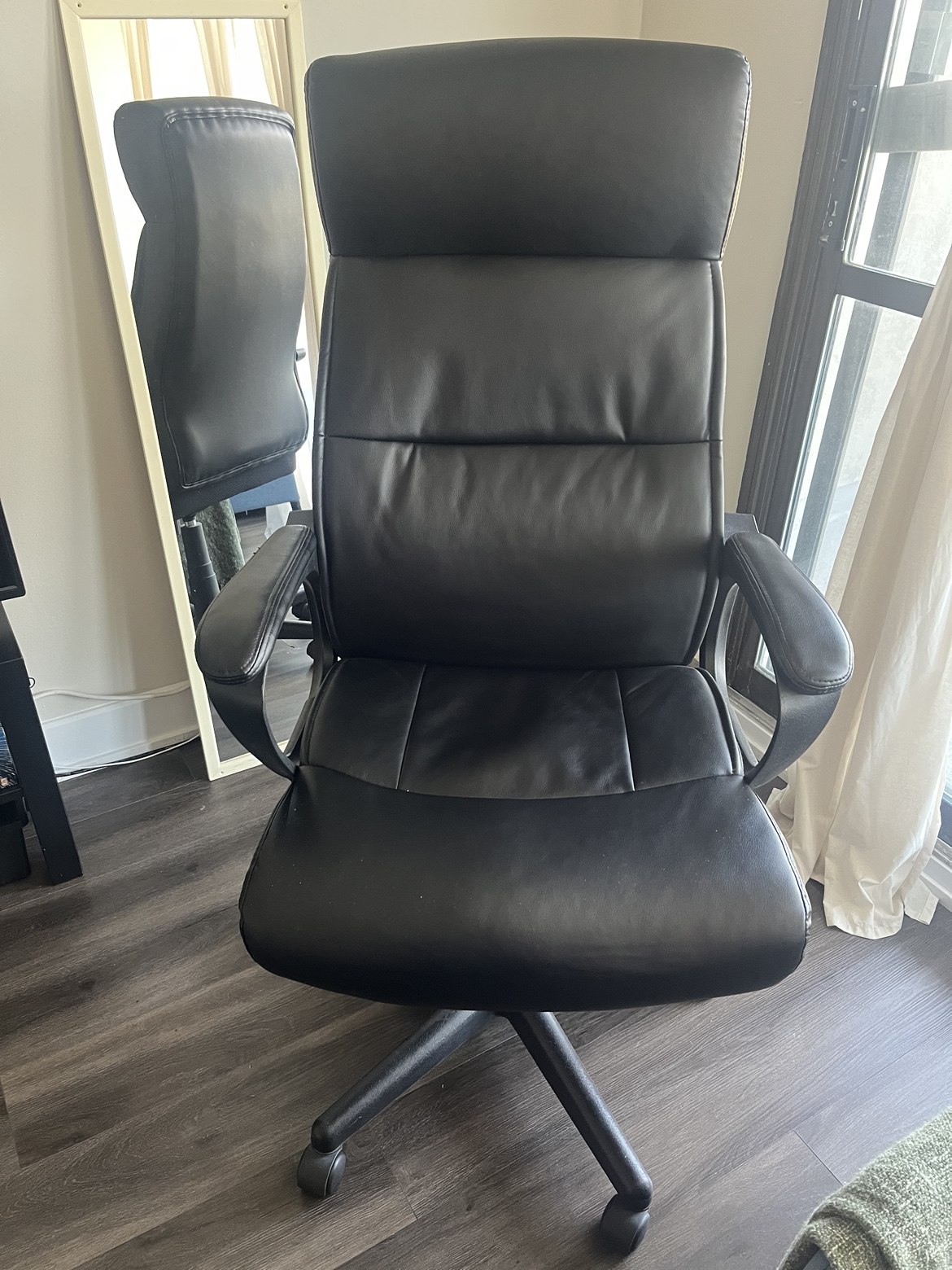 Executive office chair with high back. Bought from Canadian Tire for 250+ tax a little over a year ago. Used gently for occasional home office work in a smoke and pet-free environment. No damages at all. Still has lots of life left. Selling only because we moved and the chair doesn’t fit my new, smaller space for desk setup at home. I am sad to see it go but I would love for this chair to find a new home.