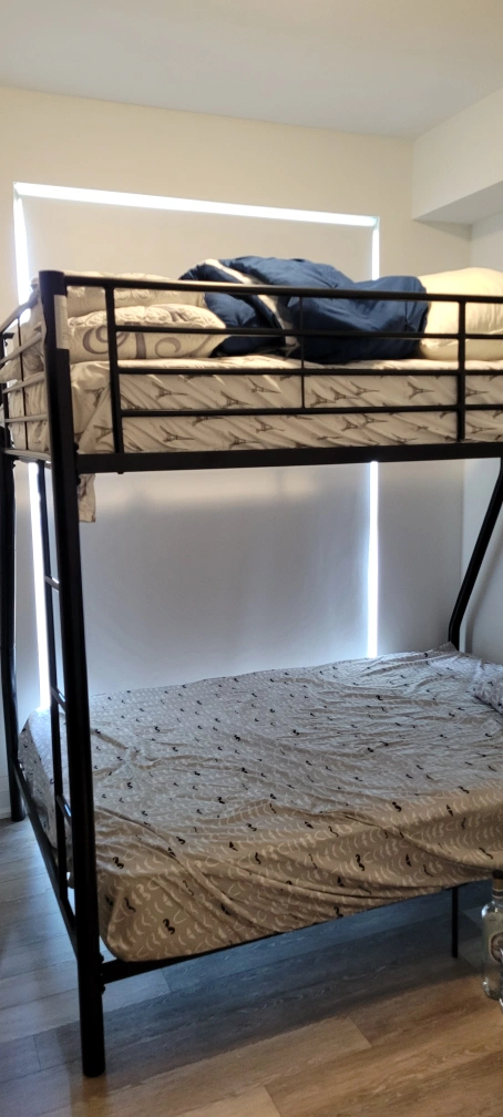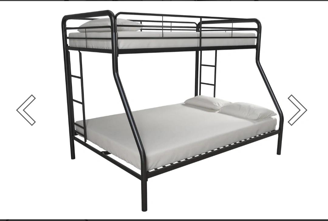 AS IS - Sturdy metal frame with steel construction. Secured easy-to-climb side ladder. The metal bunk bed includes full-length safety rails on the top bunk