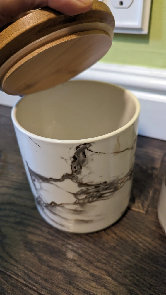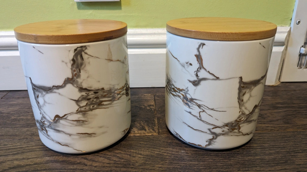Lovely pair of Porcelain Canisters with wooden lids, by Grace Pantry. White with marble and gold patten. Perfect condition