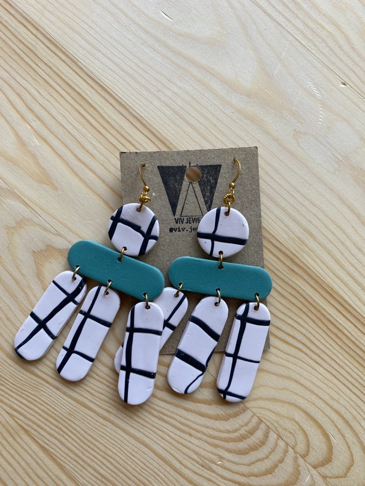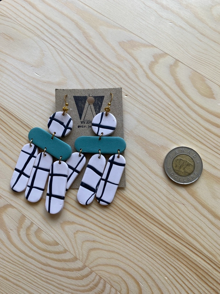 These beautiful dramatic earrings have a black and white grid with a pop of turquoise.