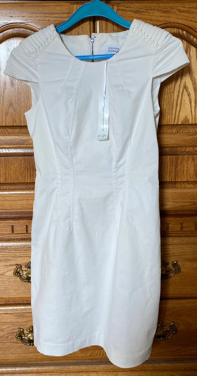 Brand new (with tag on) Steffen Schraut white dress with 100% cotton lining. Details on cap sleeves. No stain or marks. 98% cotton & 2% elastane. Size 36.