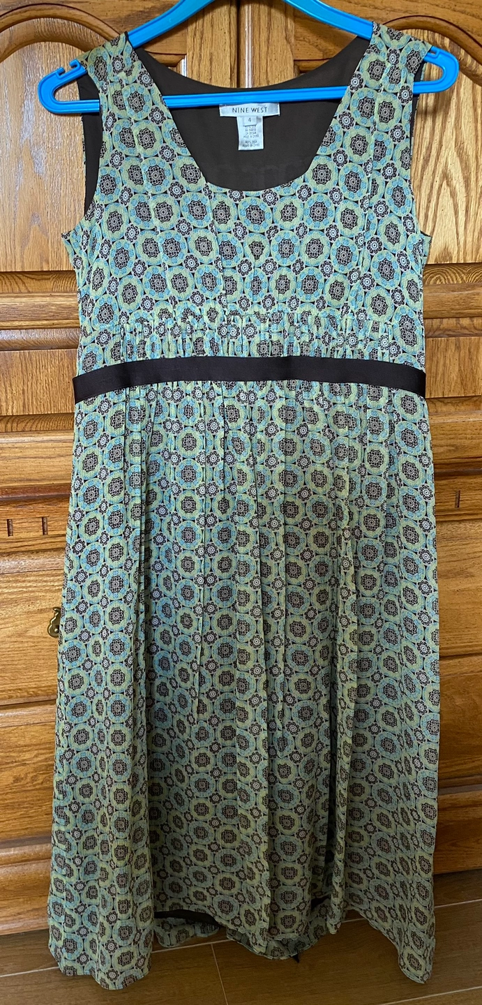 Nine West 100% silk dress with lining. Tied up ribbon on the back. With zipper on the side. Size 4. Only been wear for once or twice. Had already dry cleaned.