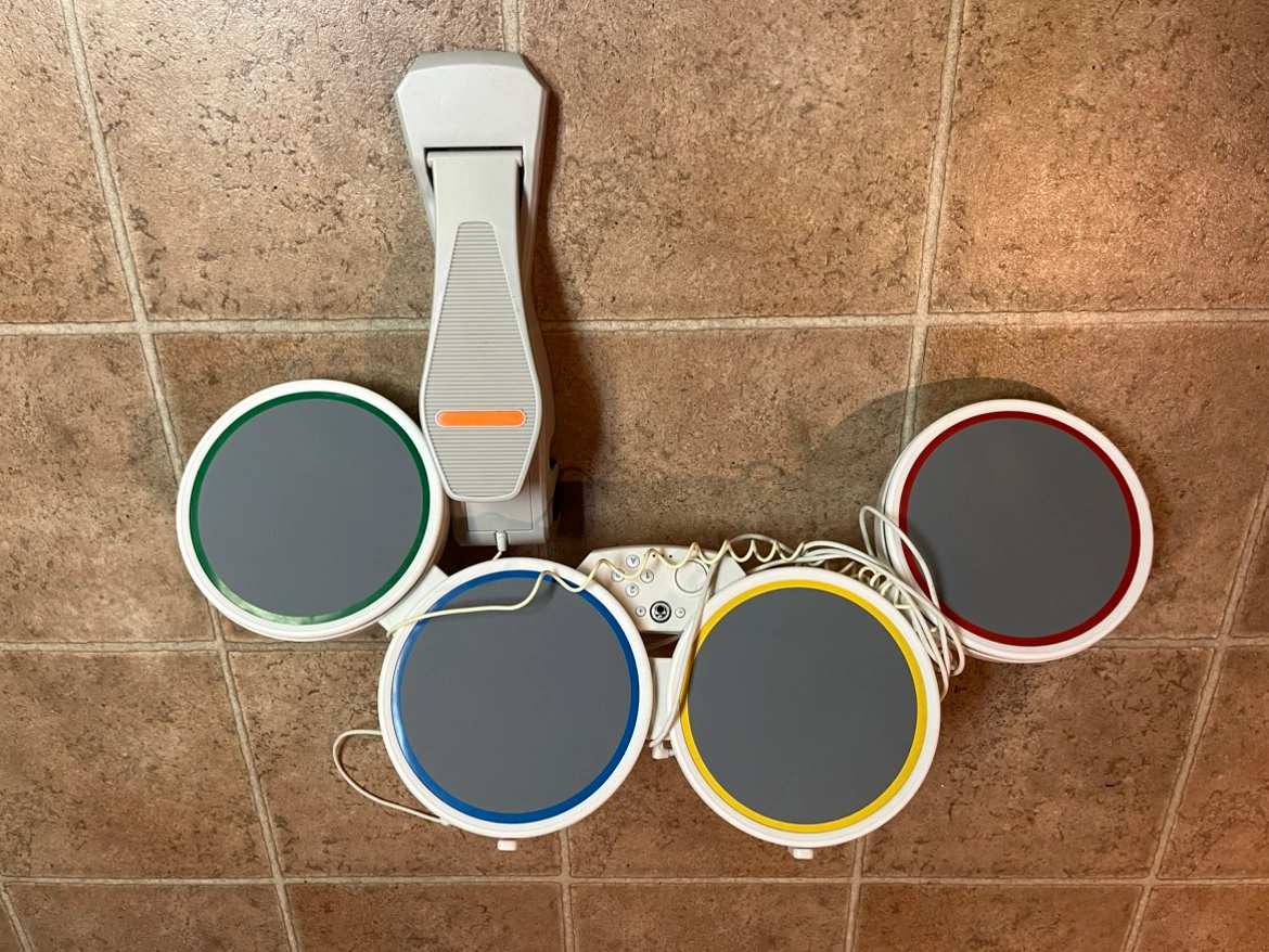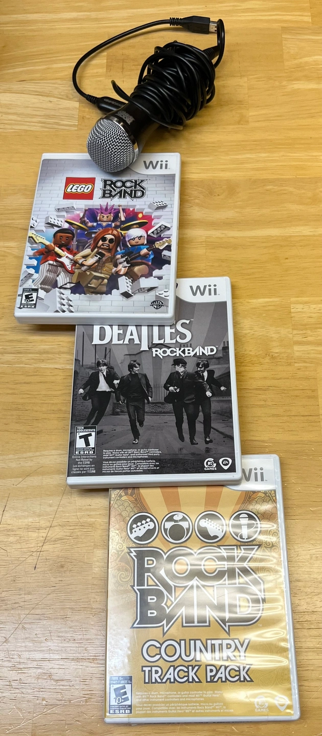 Wii guitar,drum set, mic and 3 game disks.