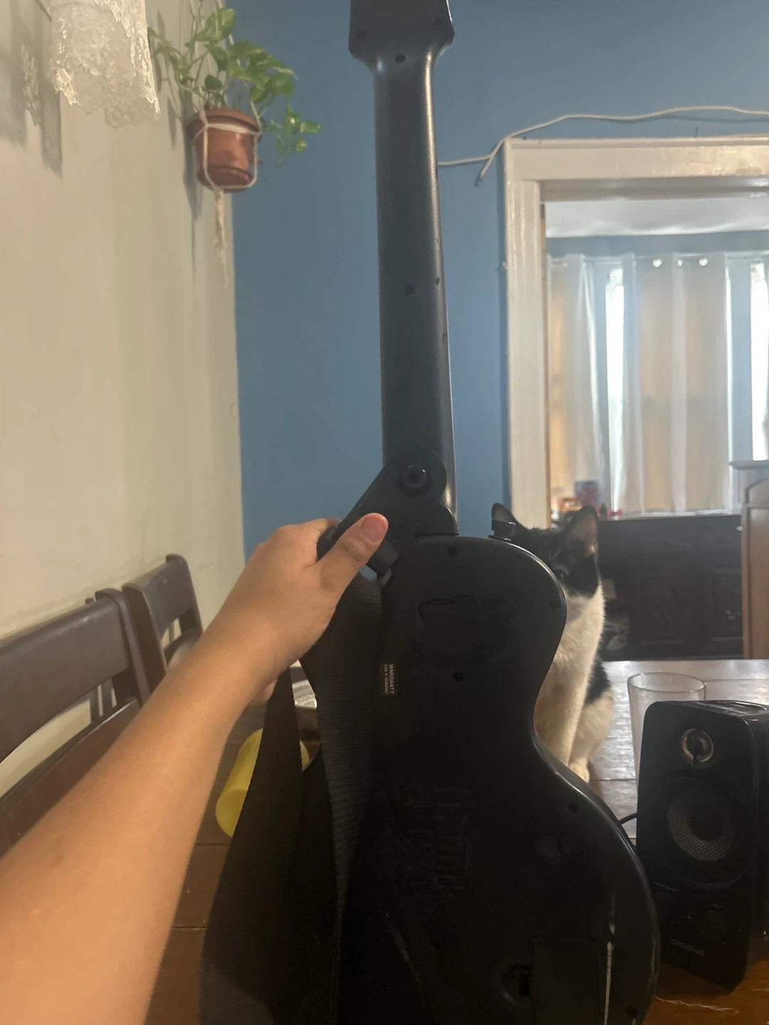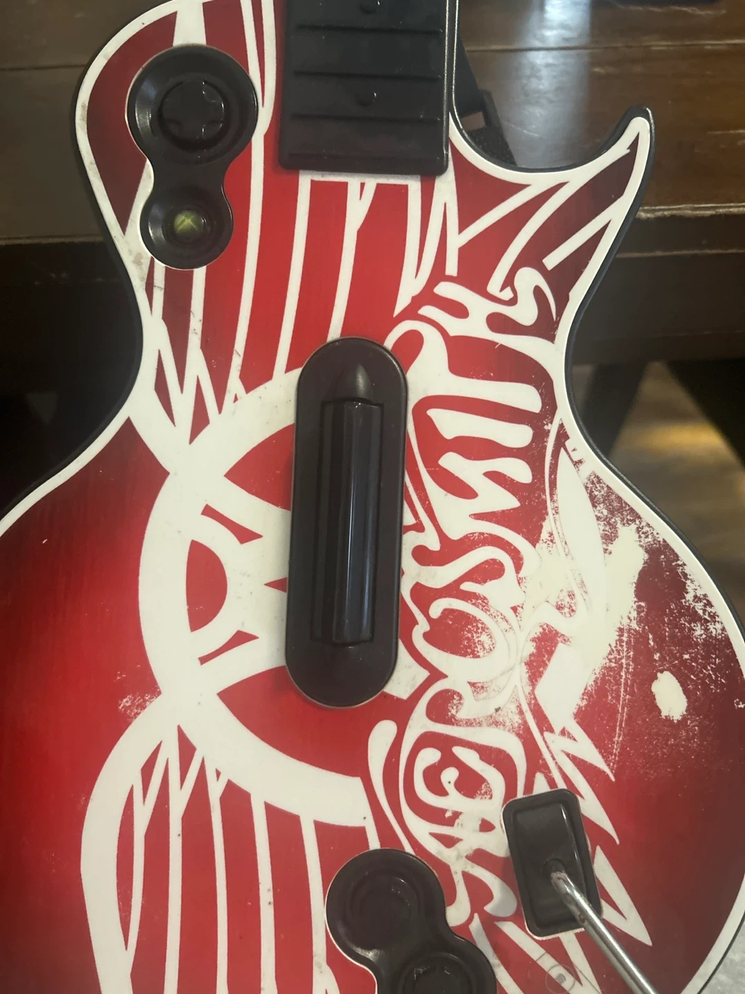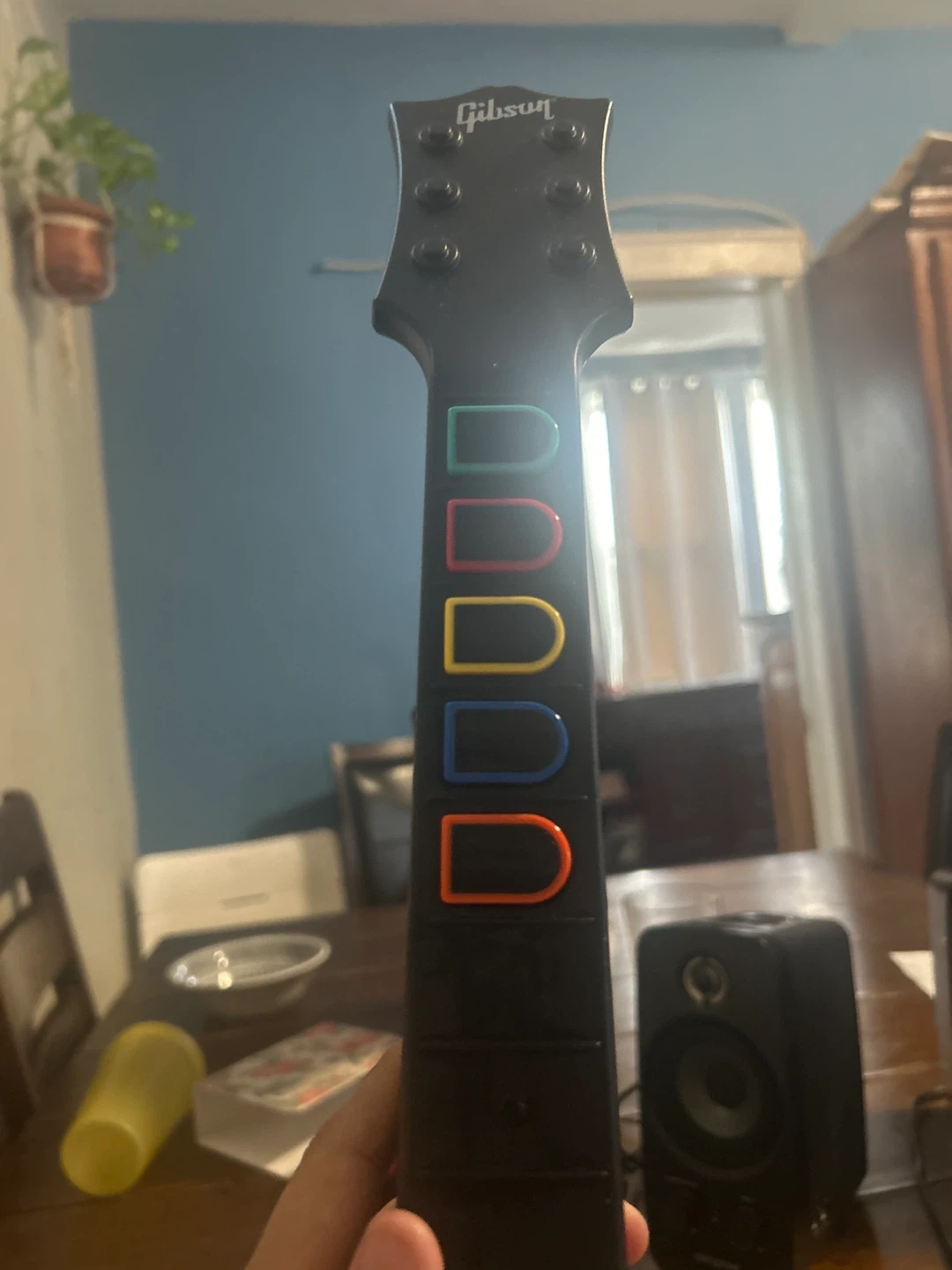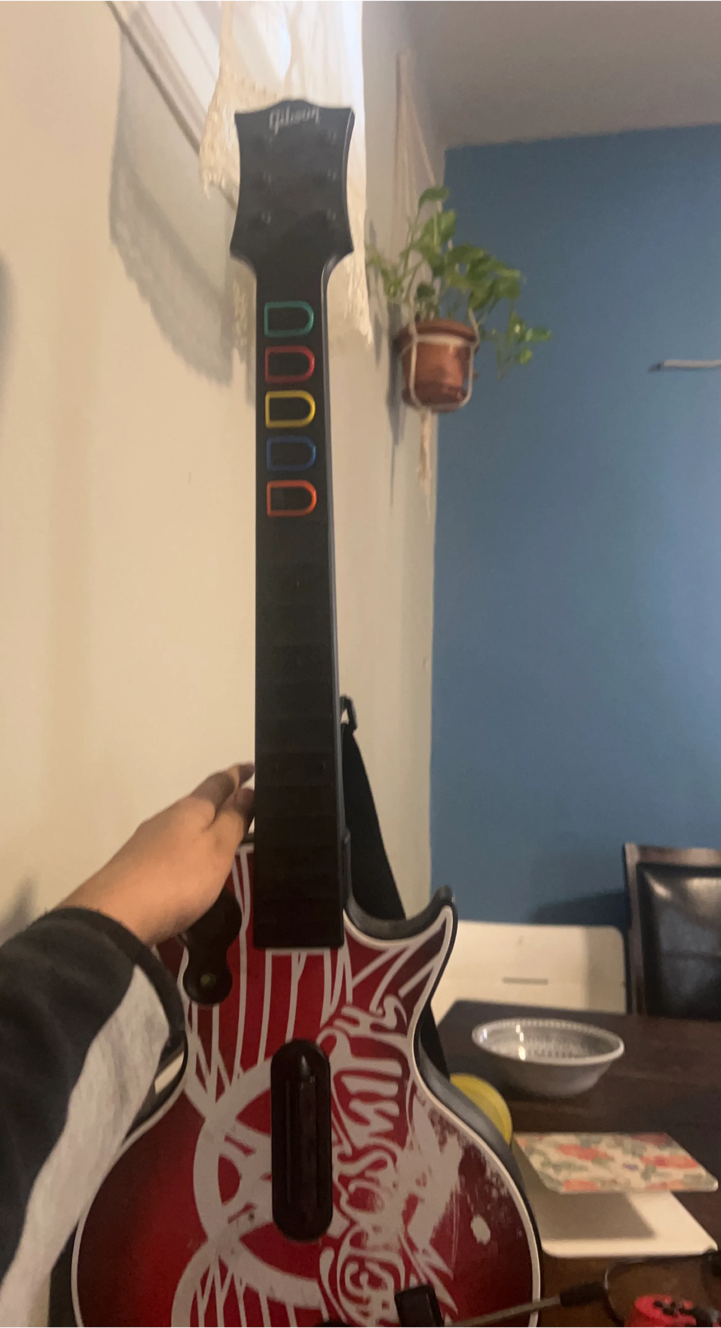 This is a Gibson branded controller for Guitar Hero. It has five colored fret buttons and a strum bar. Great for playing music rhythm games!