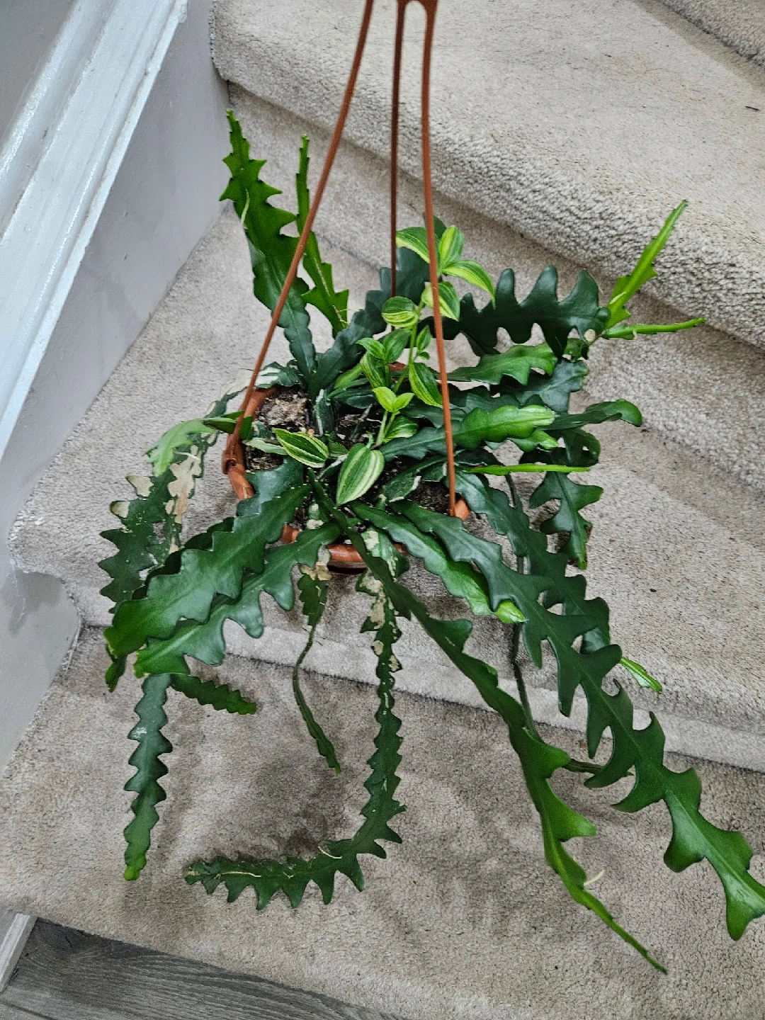 Selling a beautiful hanging fishbone cactus plant! It's a unique and eye-catching addition to any home, with its distinctive zig-zag leaves. This plant is relatively easy to care for and thrives in bright, indirect light. It comes in a hanging pot, ready to display and enjoy!